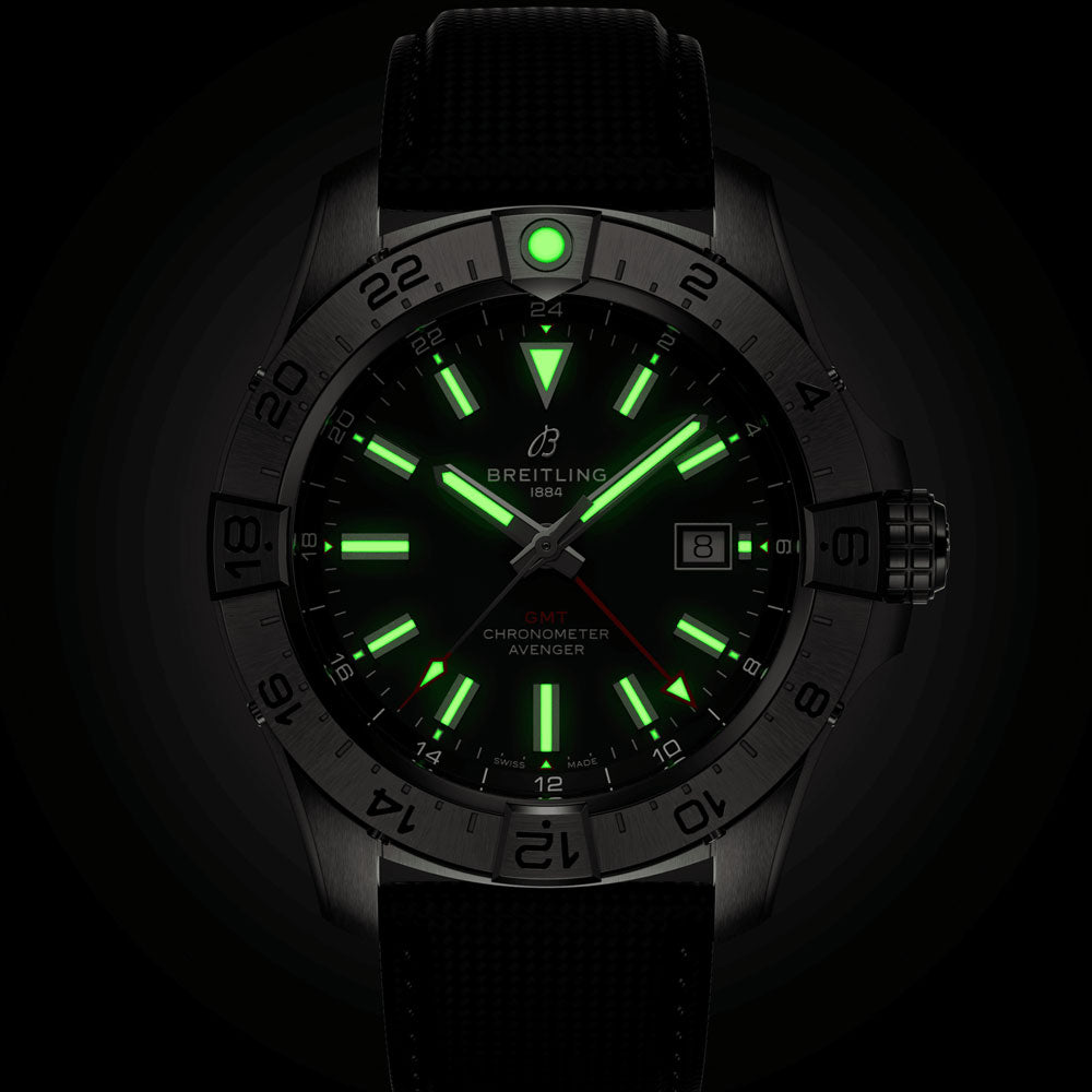 Built to withstand the demands of jet pilots. the Avenger 44mm GMT watch is designed for the most challenging cockpit environments. However. its robust design. exceptional durability. and advanced features are also appreciated by those without air force experience. Combining performance with cutting-edge modern aviation aesthetics. the collection boasts materials like stainless steel. ceramic. and titanium. inspired by aviation design. The dial colors are influenced by military uniform shades. All stainless steel models come with a choice of a military leather strap with a folding-pin buckle or a three-row stainless steel bracelet with a micro-adjustable folding clasp. Ceramic models feature a military leather strap with a titanium folding-pin buckle. Plus. with 300 m water resistance. enhanced functionality. and a corrosion-resistant build. the Avenger is ready for any adventure. whether it involves a barrel roll or not.