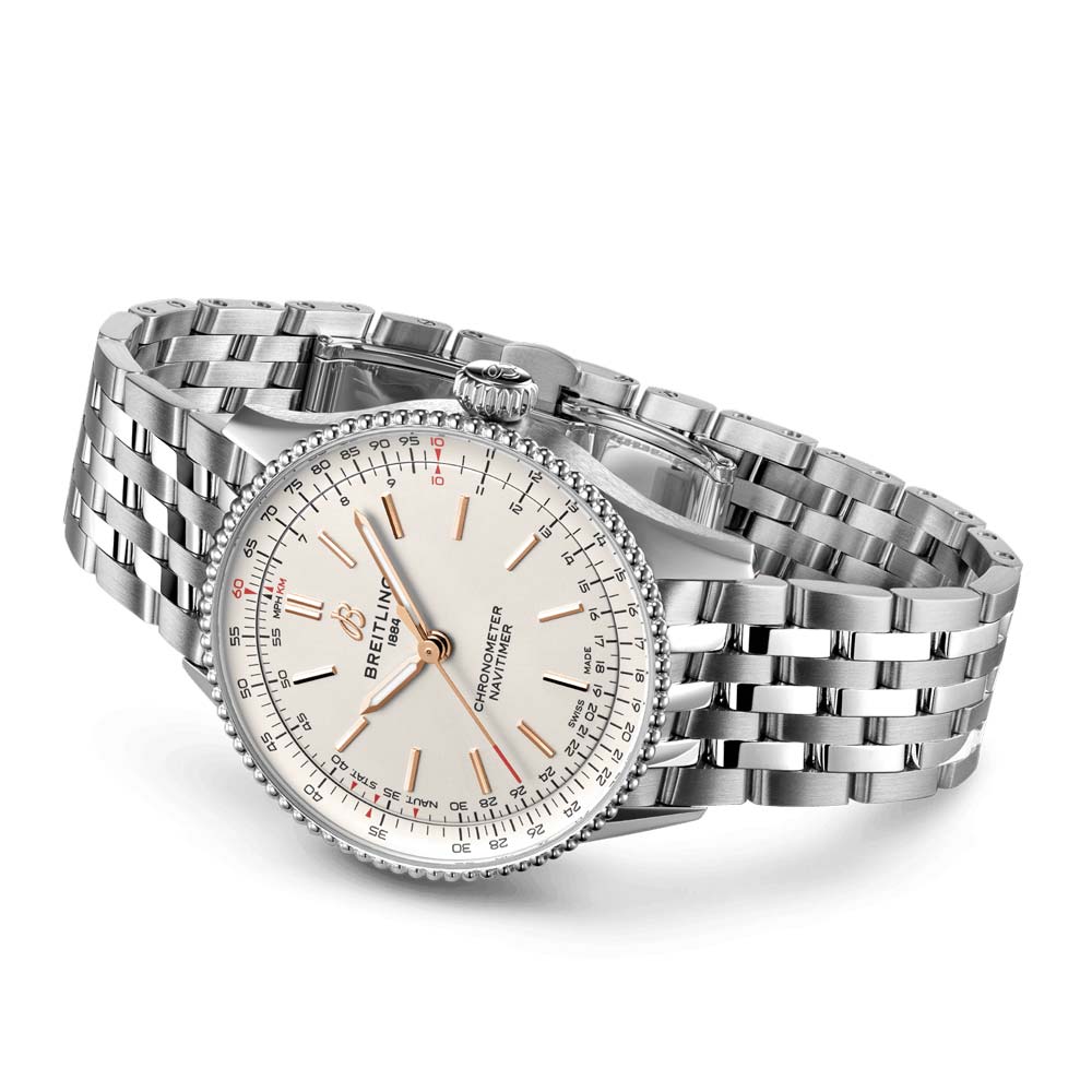 The Navitimer is a role model for timepiece aficionados everywhere. It has been hailed as one of the greatest watches of all time and its origin dates back to 1952. With 36 and 32mm sizes. this iconic watch can accompany anyone's journey. The 36mm option preserves the signature beaded bezel and slide rule. while the 32mm variation features a simplified dial design. Refinements and pops of pastel. mother of pearl. and precious metals lend a luxurious feel. ensuring the Navitimer is sure to be a reliable companion no matter the destination.