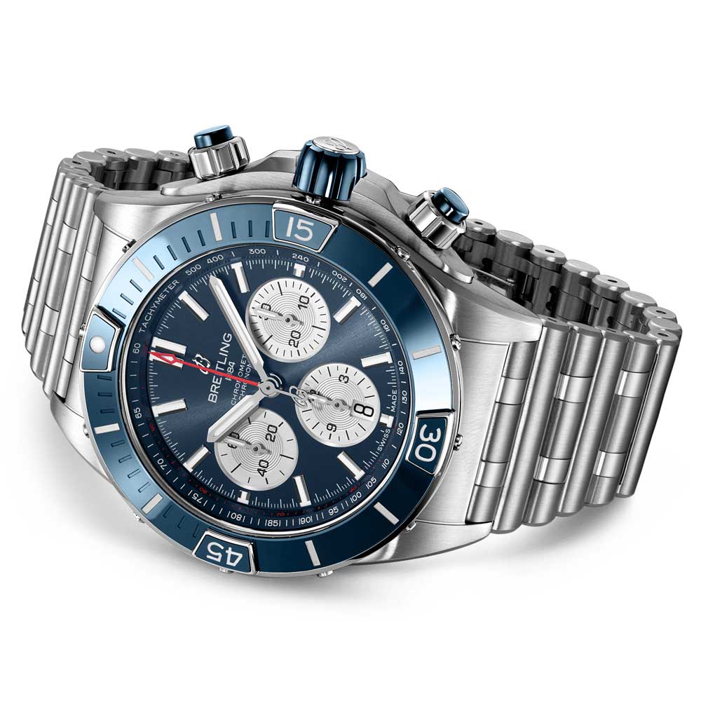 The Super Chronomat is a supercharged. multi-purpose timepiece from Breitling. Inspired by the iconic Chronomat of the 1980s. this bold watch offers various ceramic inserts on its bezel. chronograph pushers and crown. It comes in a range of metals. including stainless steel and 18ct red gold. with a Rouleaux-inspired rubber strap or Rouleaux bracelet and folding clasp. The Super Chronomat B01 44 features the Breitling Manufacture Calibre 01 - a COSC-certified chronometer.