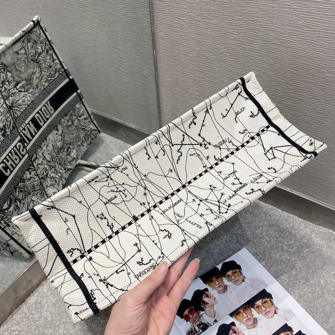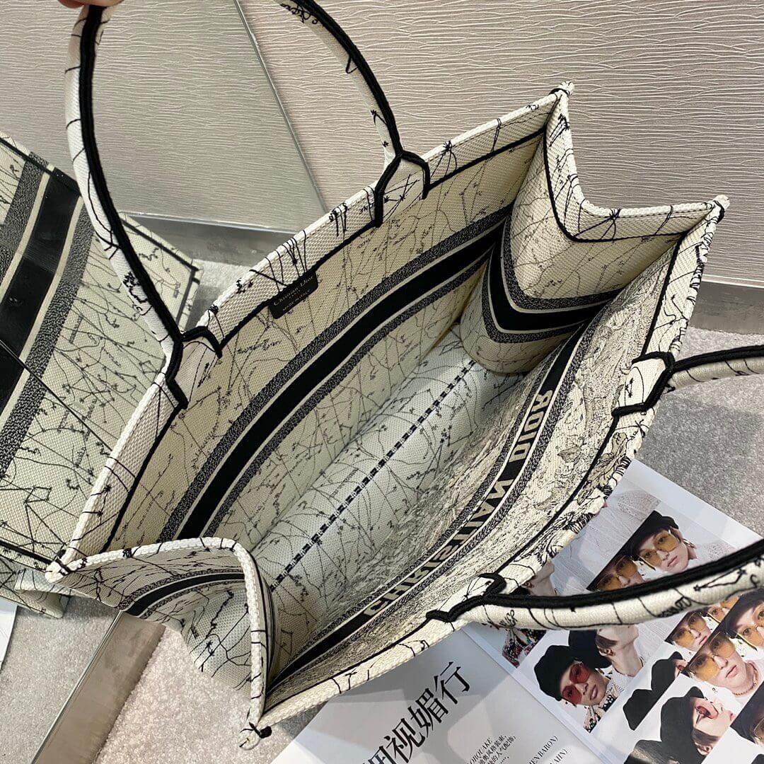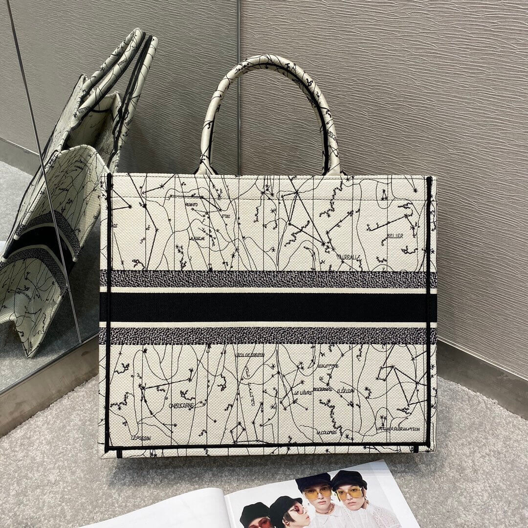 The Dior Book Tote, an original style introduced by Creative Director Maria Grazia Chiuri, has become a staple of the Dior aesthetic. This latte silhouette is fully embroidered with the Dior Zodiac motif, channeling Mr. Dior's fascination for astrology. Adorned with the 'Christian Dior' signature, the Dior Book Tote exemplifies the House's signature savoir-faire.