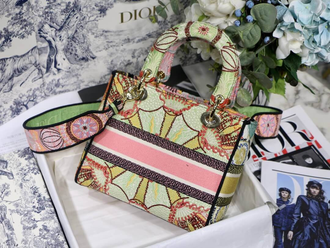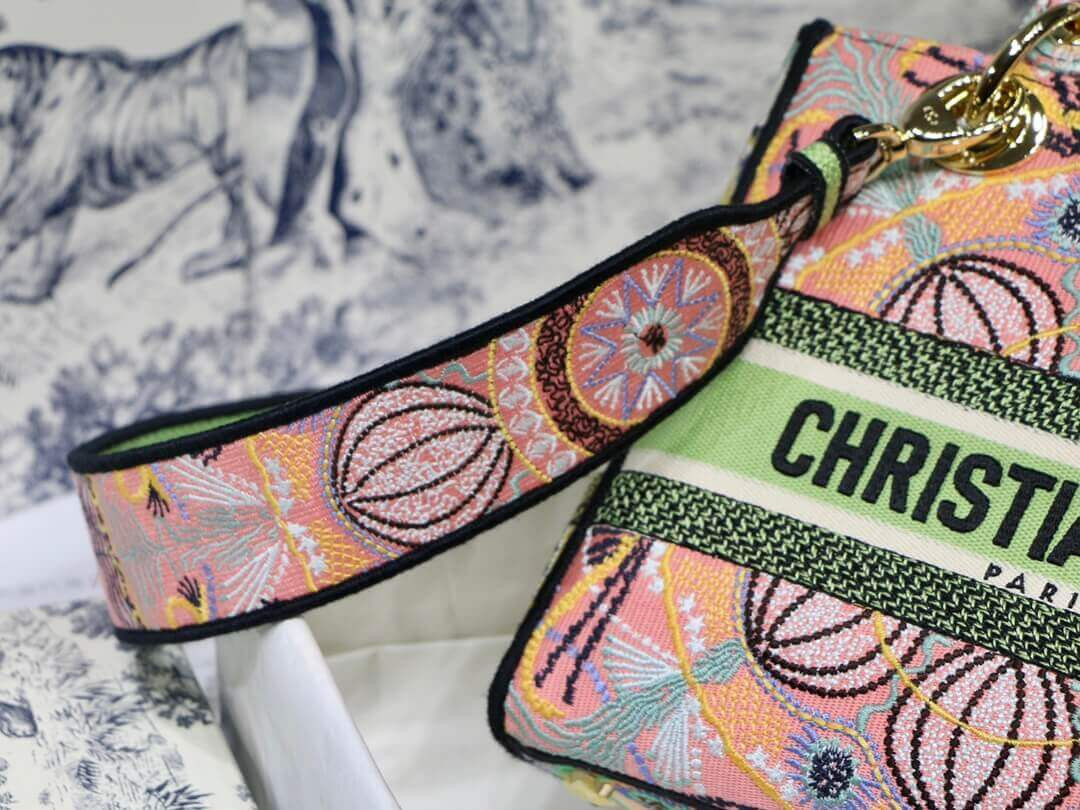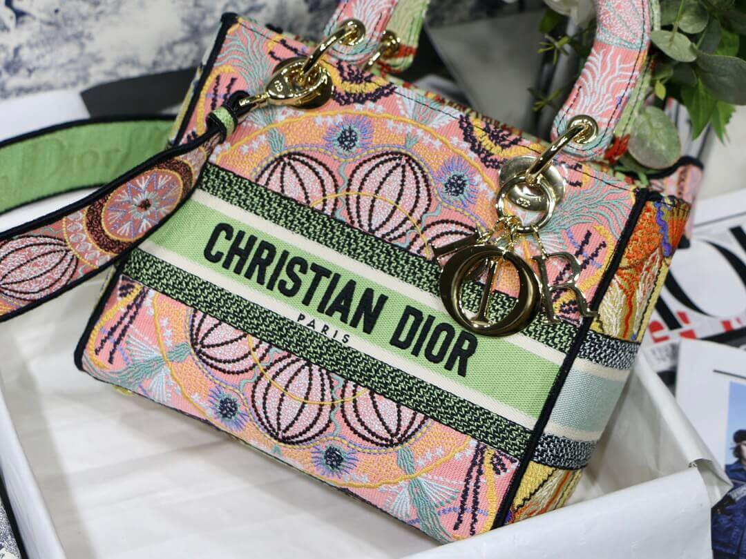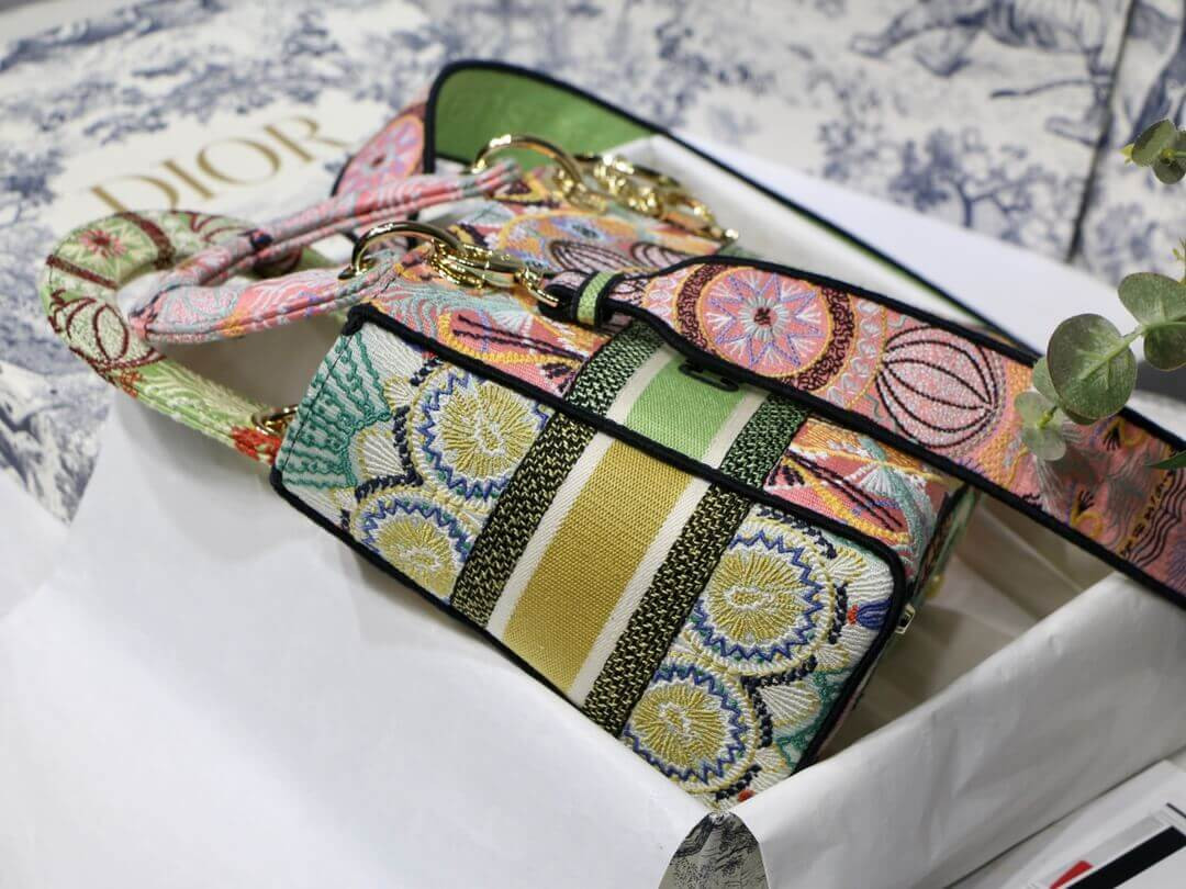 The Lady D-Lite bag combines classic elegance with the modernity of the House. This style, fully embroidered with the graphic Dior In Lights motif, is inspired by the light festivals in the south of Italy. Each of the four sides showcases a different color for a patchwork-like look. Featuring a 'Christian Dior' signature on the front and thick pale gold-finish metal 'D.I.O.R.' charms, it is equipped with a wide, reversible and removable embroidered shoulder strap. The medium bag can be carried by hand, worn over the shoulder or crossbody and pairs easily with other matching Dior In Lights creations of the season.
