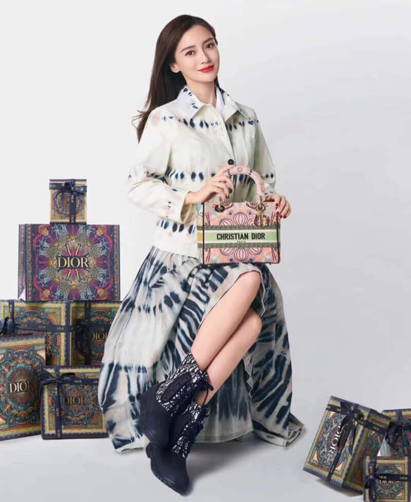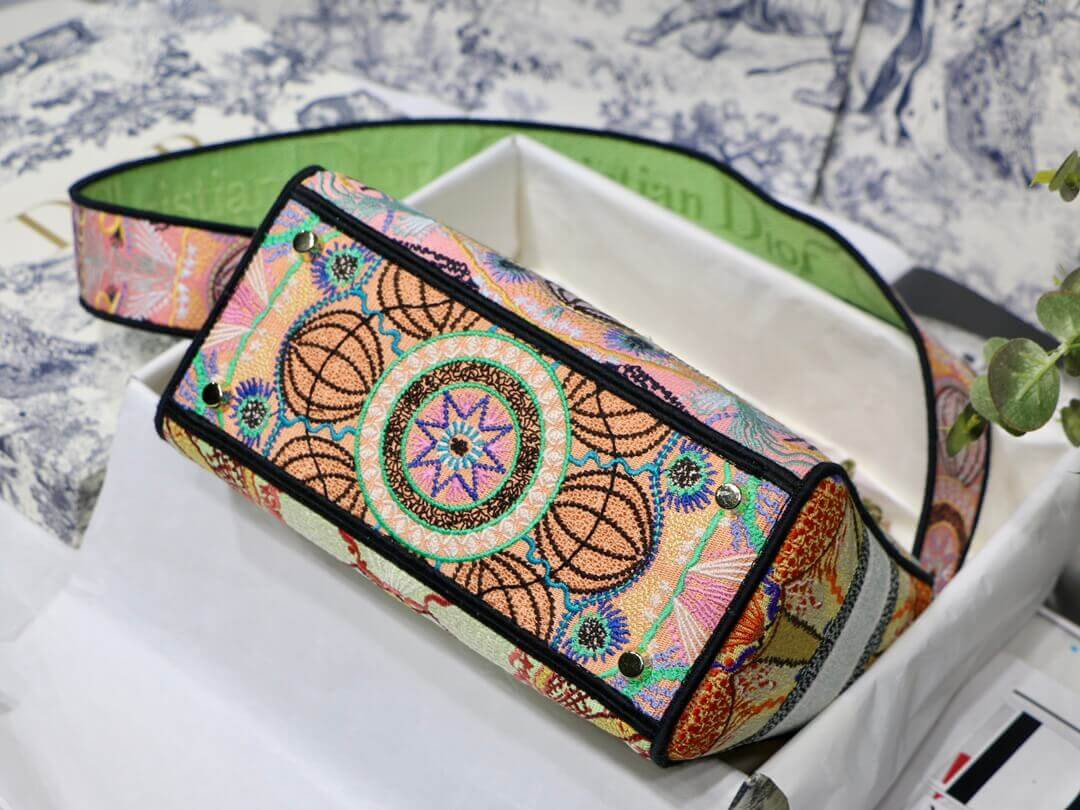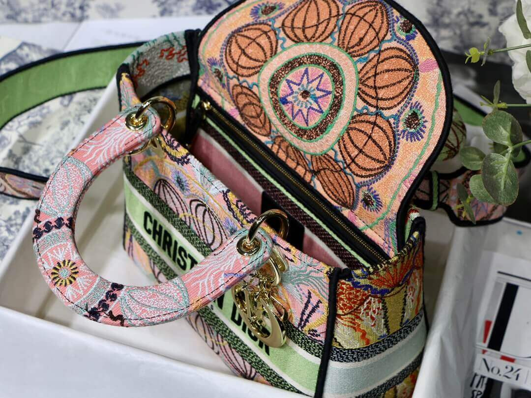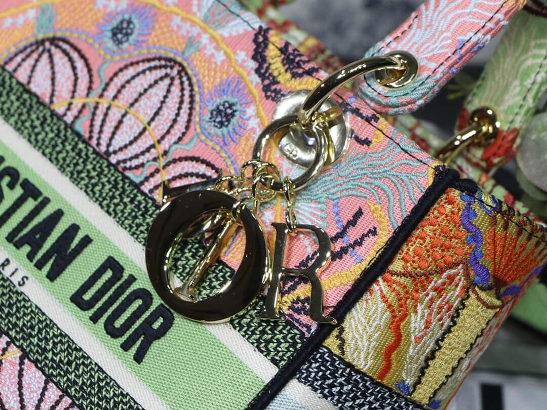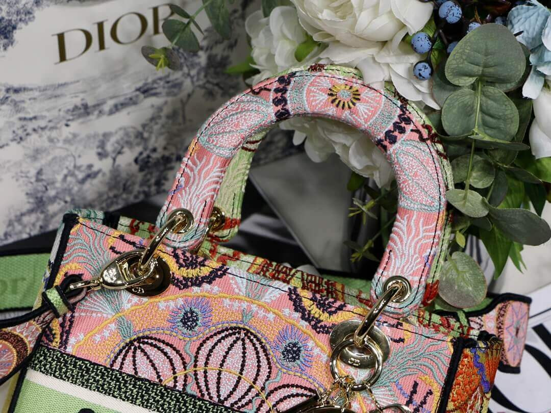 The Lady D-Lite bag combines classic elegance with the modernity of the House. This style, fully embroidered with the graphic Dior In Lights motif, is inspired by the light festivals in the south of Italy. Each of the four sides showcases a different color for a patchwork-like look. Featuring a 'Christian Dior' signature on the front and thick pale gold-finish metal 'D.I.O.R.' charms, it is equipped with a wide, reversible and removable embroidered shoulder strap. The medium bag can be carried by hand, worn over the shoulder or crossbody and pairs easily with other matching Dior In Lights creations of the season.