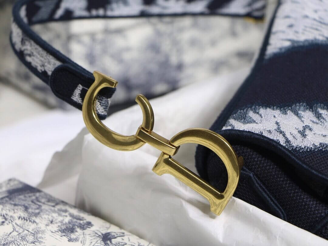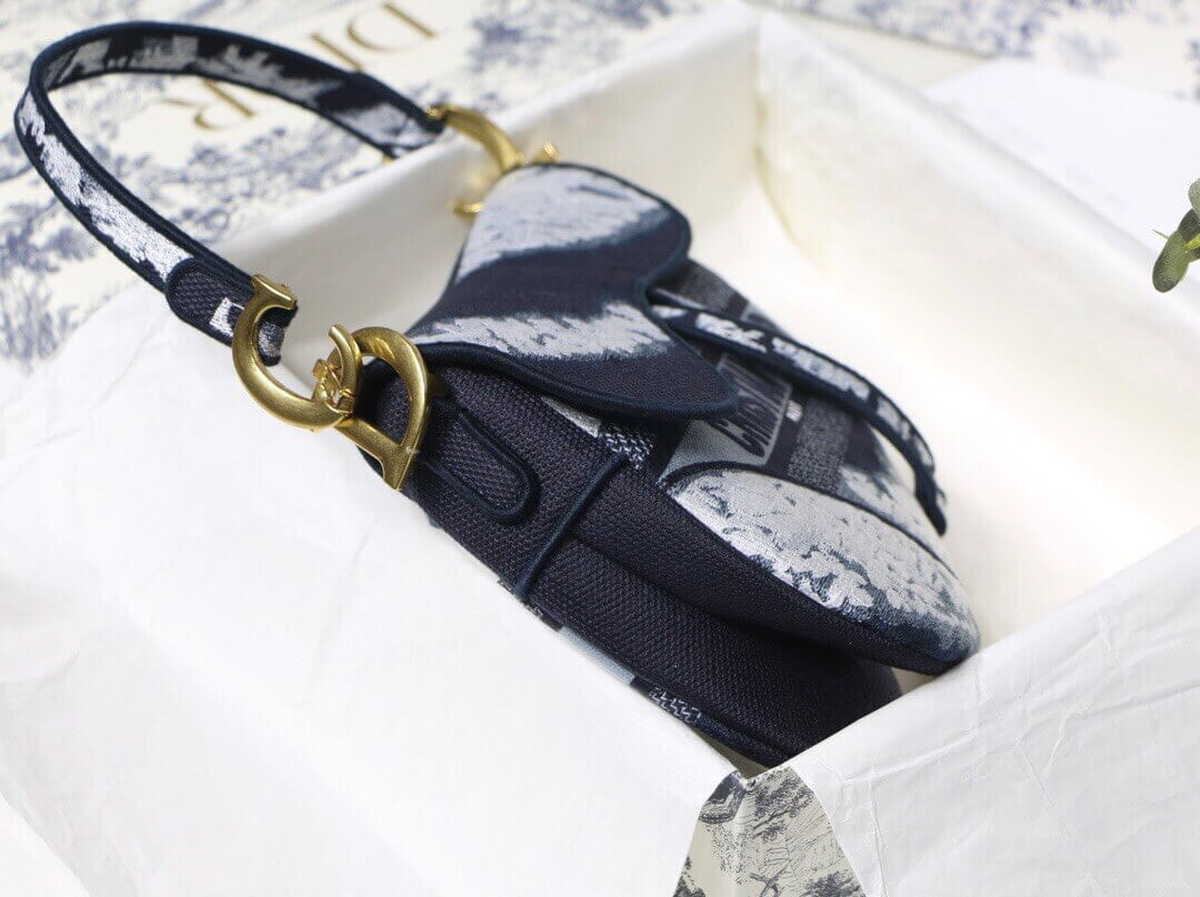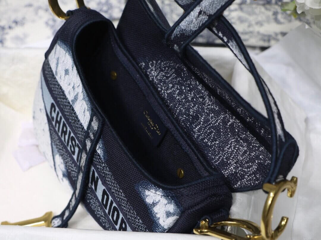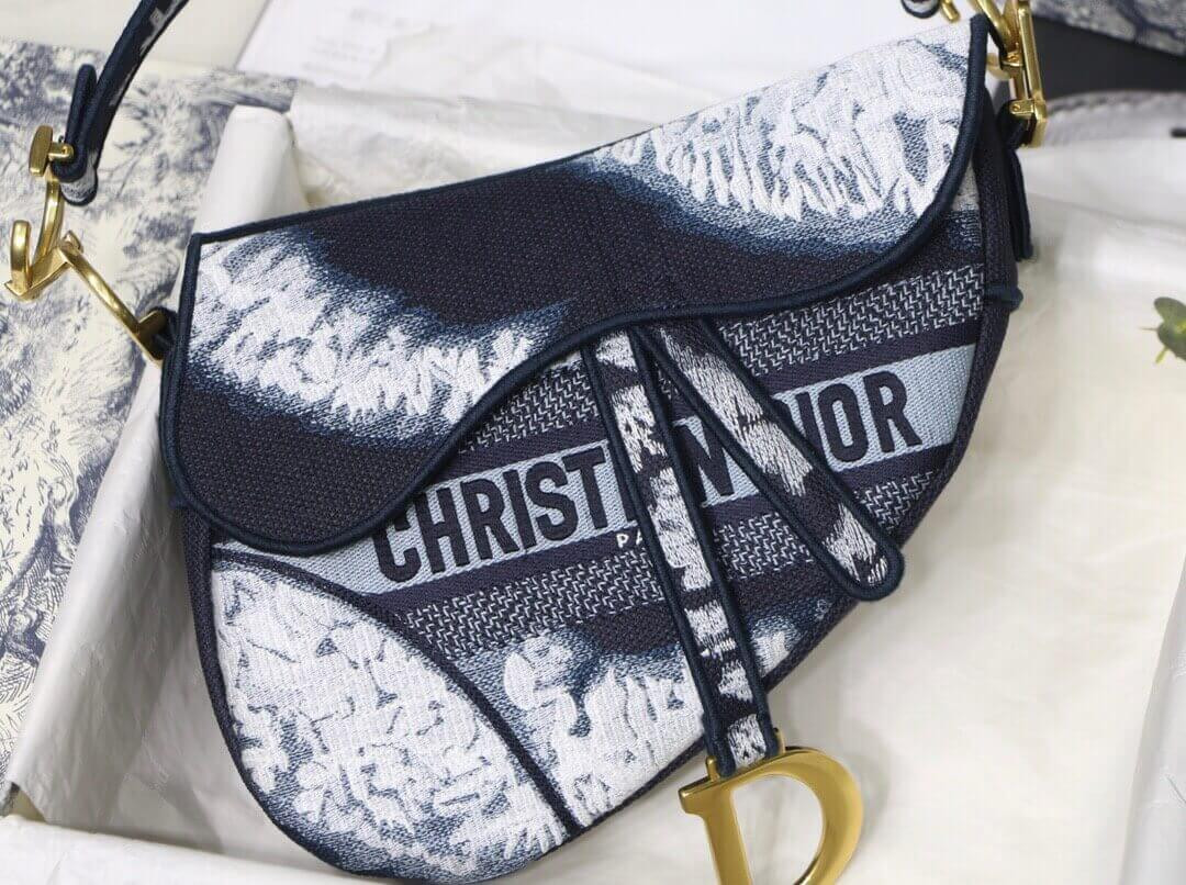 Maria Grazia Chiuri brings a fresh update to the iconic Saddle bag with an eye-catching design. This heritage style showcases the emblematic 'D'-stirrup magnetic clasp and saddle flap with the signature 'CD' structure on both sides of the handle, giving it an instantly modern feel. The fully embroidered blue tie & dye style has antique gold-finish hardware and the 'Christian Dior' signature on the front. The medium style may be customized with alternative straps.