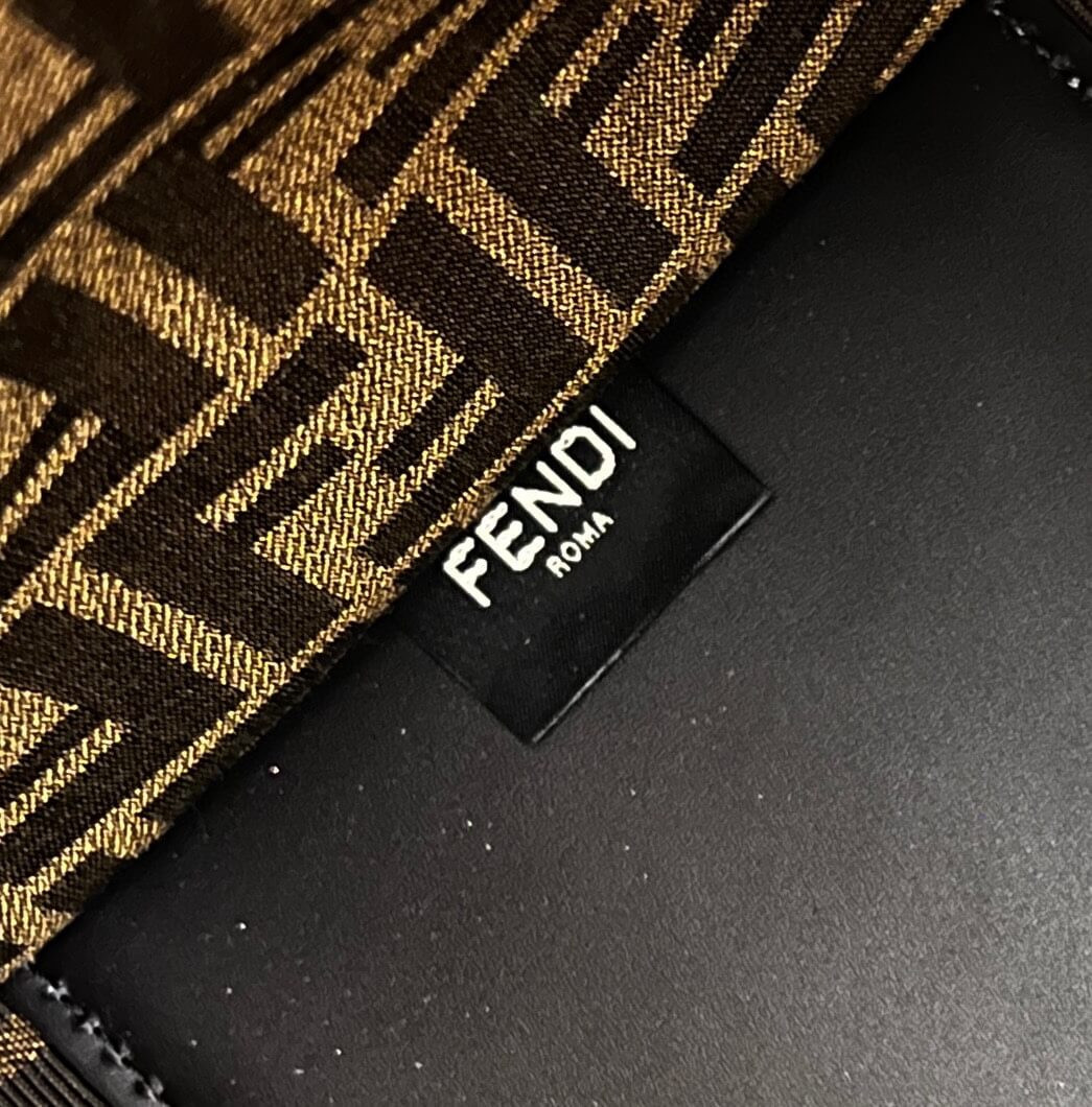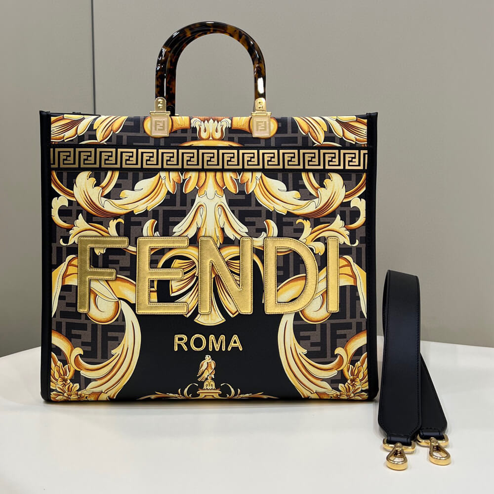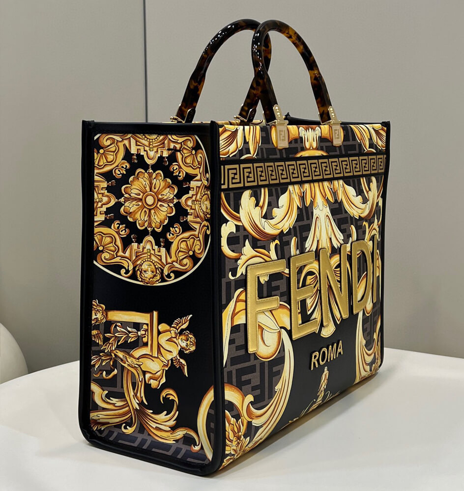 Seen through the eyes of Donatella Versace, Fendi's Sunshine leather tote bag is reimagined with Very Versace elements in the latest Fendi by Versace capsule collection. In the Fendace Gold Baroque print, it features signature hinged tortoiseshell handles and a foiled Fendi Roma logo at the front. The spacious shopper is complete with a Fendace boarder, a FF monogramed lining and a detachable shoulder strap.