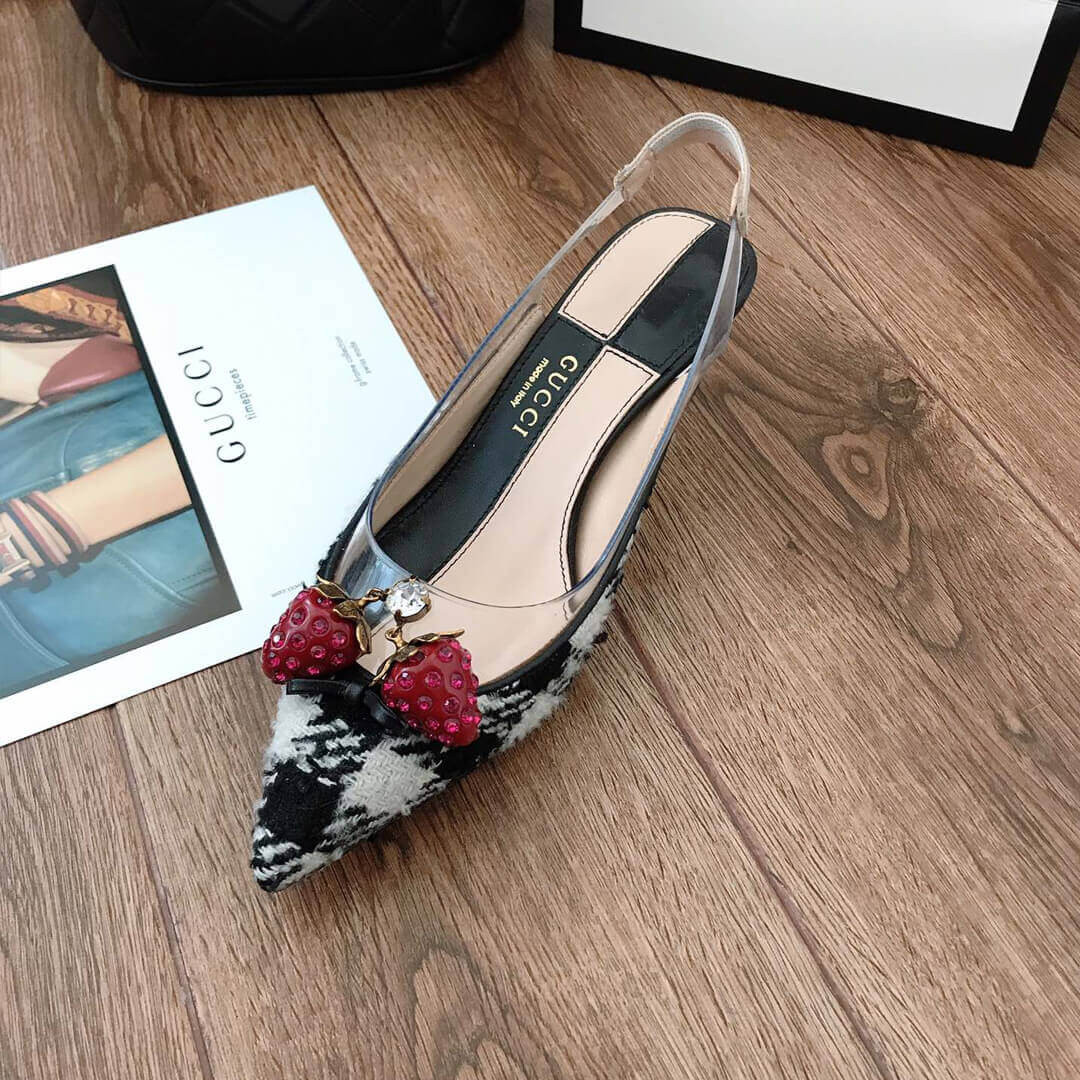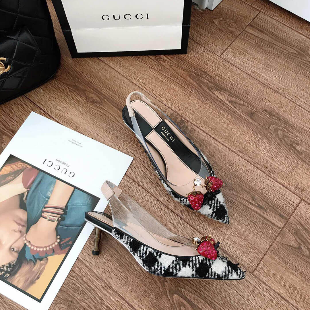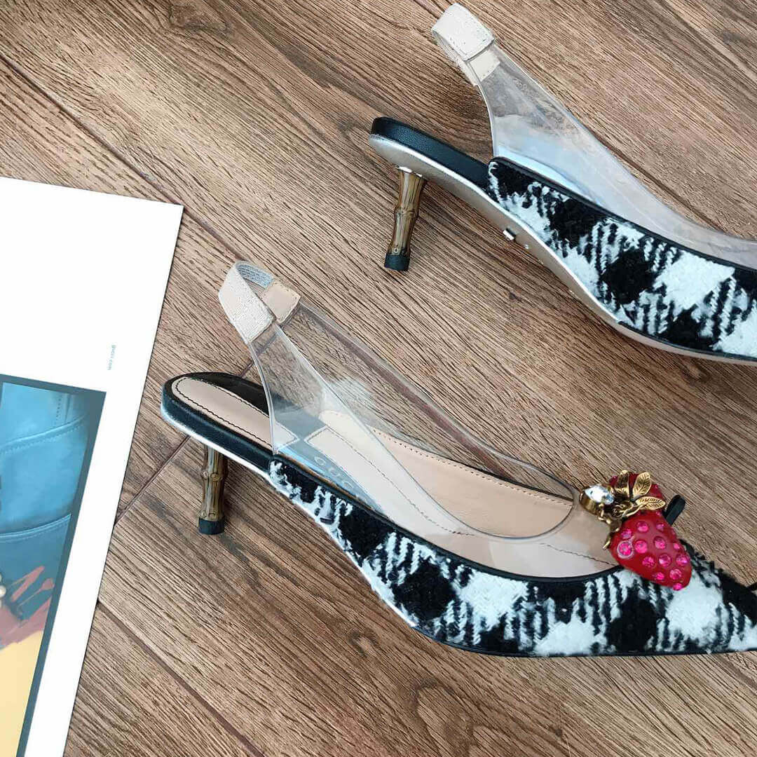 Gucci’s black Eleonor slingback pumps are adorned with red crystal-embellished strawberries that feature in the house’s menagerie of motifs. They’re crafted in Italy from glossy patent leather with a clear PVC insert, then set on a brown bamboo kitten heel. Wear them beneath a tailored jacket and skirt for a whimsical dinner edit.