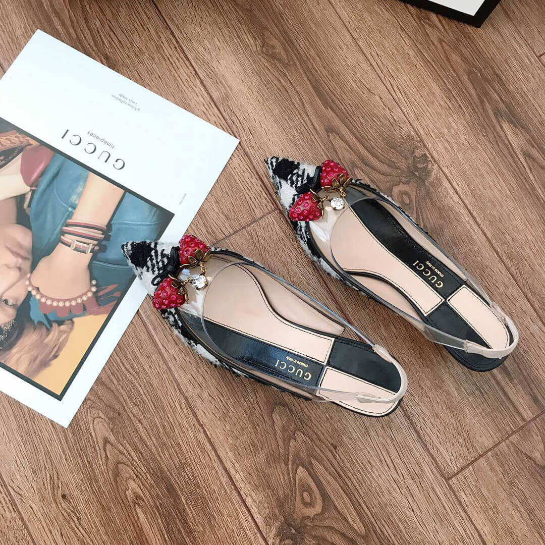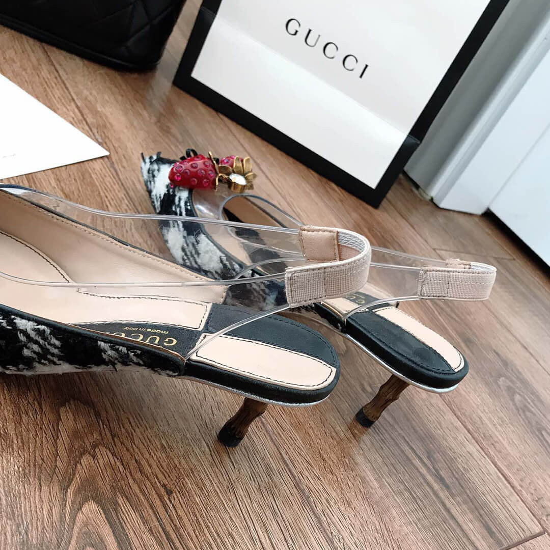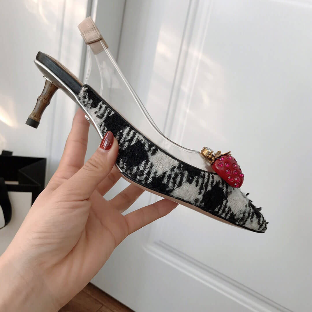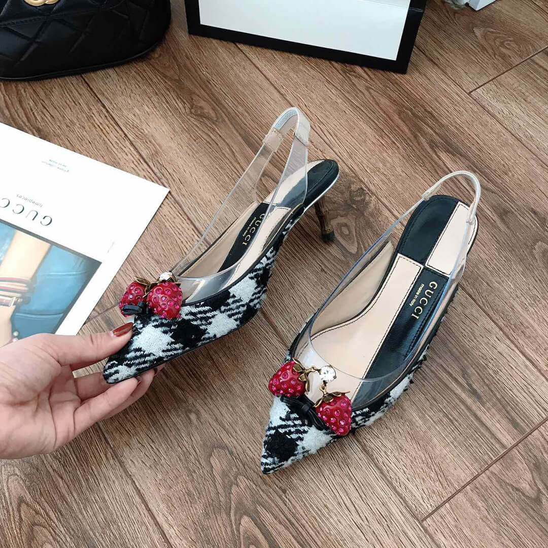 Gucci’s black Eleonor slingback pumps are adorned with red crystal-embellished strawberries that feature in the house’s menagerie of motifs. They’re crafted in Italy from glossy patent leather with a clear PVC insert, then set on a brown bamboo kitten heel. Wear them beneath a tailored jacket and skirt for a whimsical dinner edit.