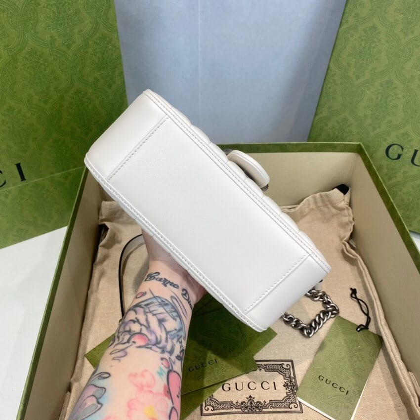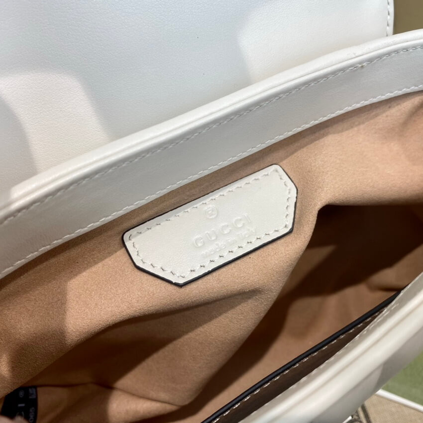 Gucci Aria explores the House's archives, telling Gucci's story though a mix of archival and contemporary elements. The GG Marmont was introduced in one of the Creative Director's first fashion shows and each season its design evolves through the lens of the latest collection. Here, the mini bag is presented in soft white matelassé leather with antique silver-toned hardware.