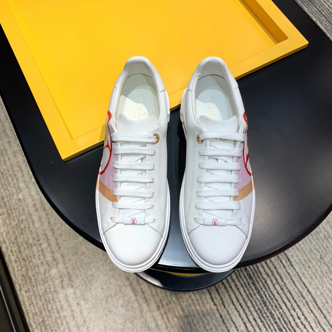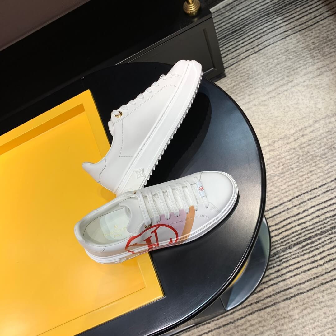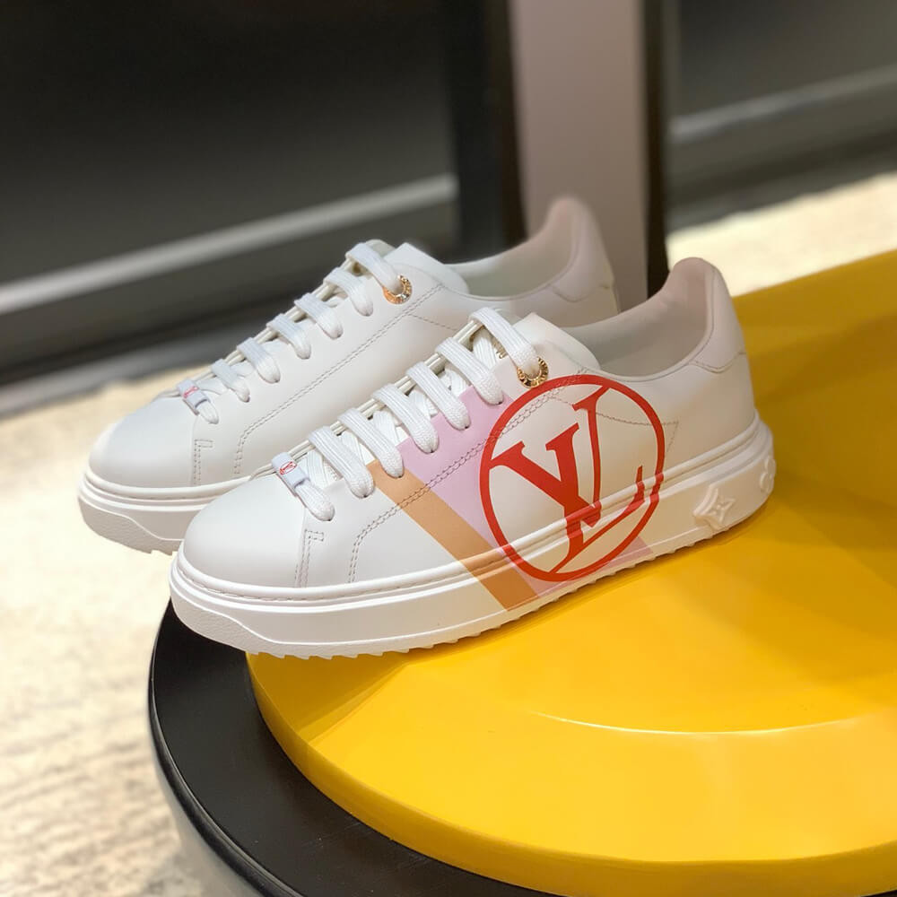 The Time Out sneaker is crafted from soft white calf leather, which is emblazoned with a graphic stripe and an oversized LV Circle signature. This sneaker is notable for its fashionable elevated outsole with a motif of Monogram Flowers. The Louis Vuitton signature is embossed in gold on the tongue.