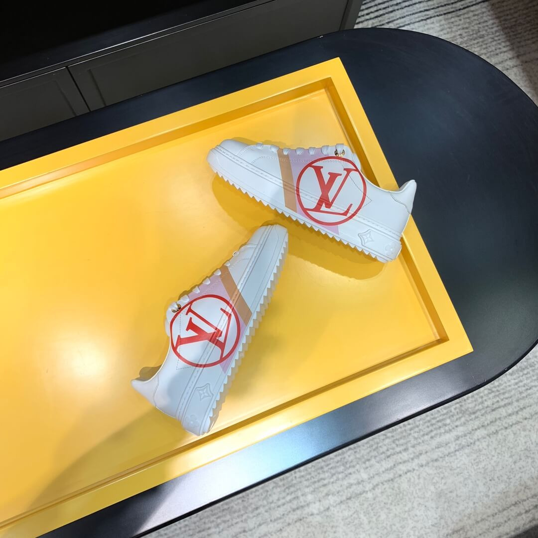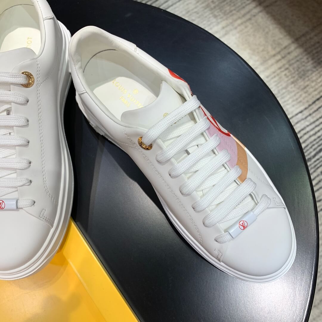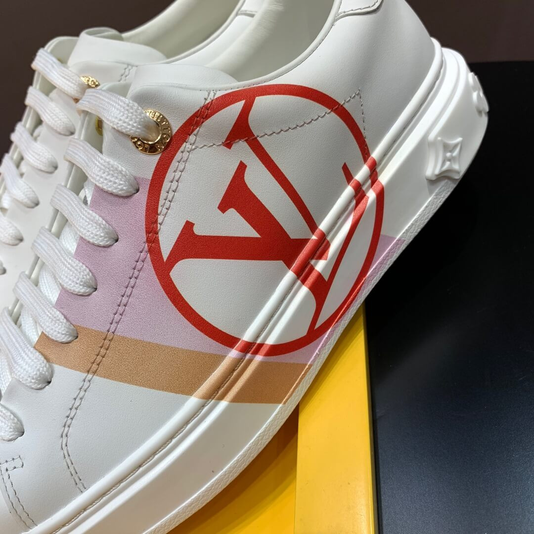 The Time Out sneaker is crafted from soft white calf leather, which is emblazoned with a graphic stripe and an oversized LV Circle signature. This sneaker is notable for its fashionable elevated outsole with a motif of Monogram Flowers. The Louis Vuitton signature is embossed in gold on the tongue.