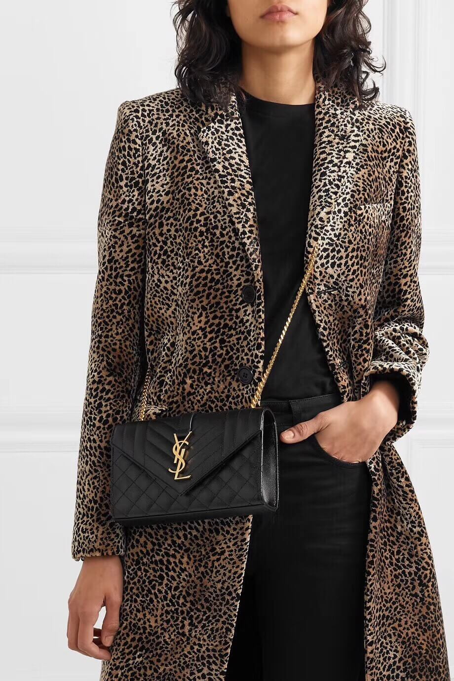 Saint laurent monogram bag with a front flap and snap button fastening, featuring an attached lanyard, interlaced ysl initials and mixed matelasse quilted overstitching.