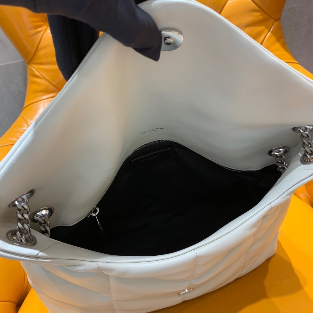 Bag with a flap, decorated with ysl initials and featuring a leather-reinforced shoulder strap chain.