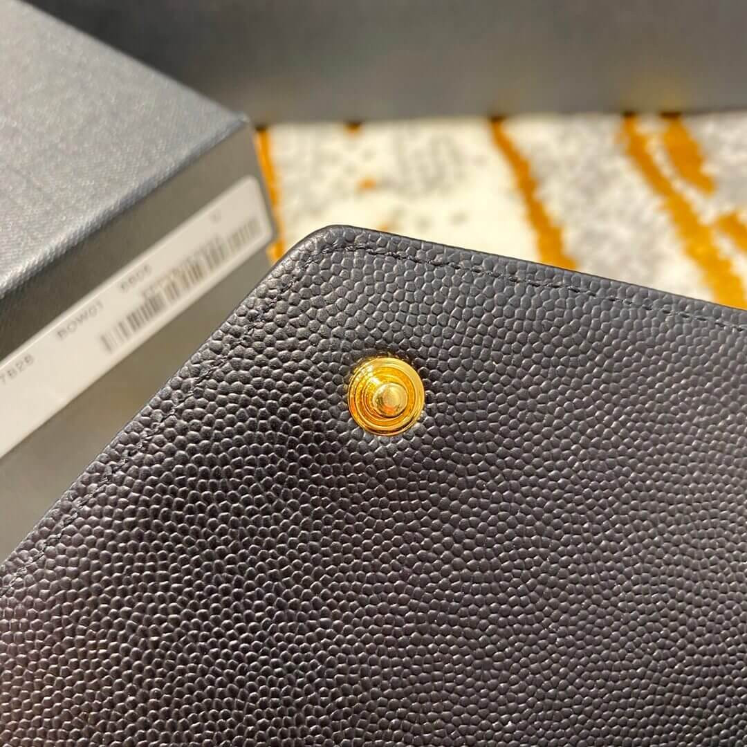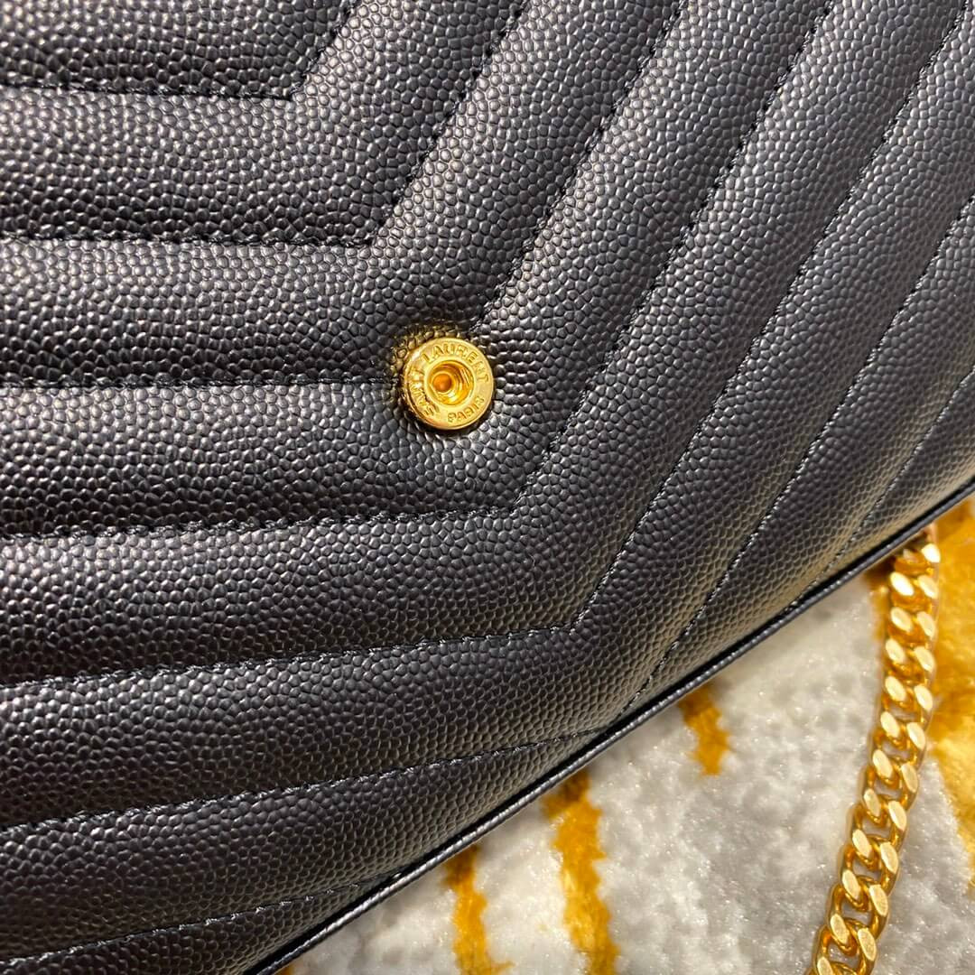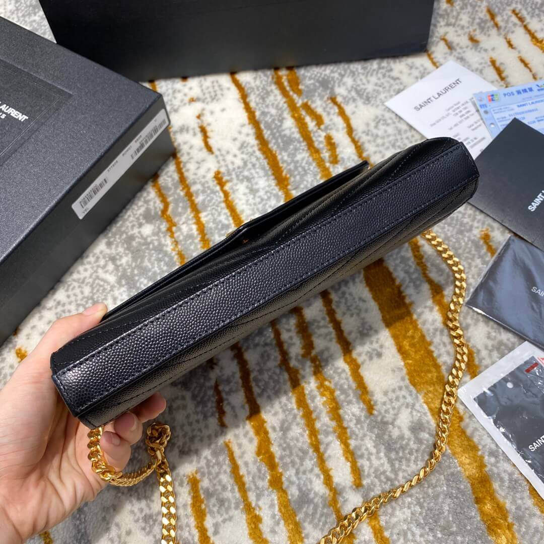 Classic monogram saint laurent flap front wallet with removable metal chain, metal interlocking ysl signature and matelassé stitching.