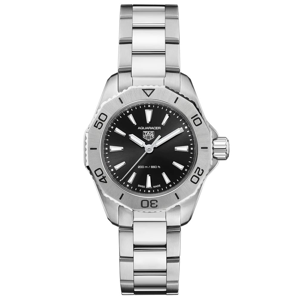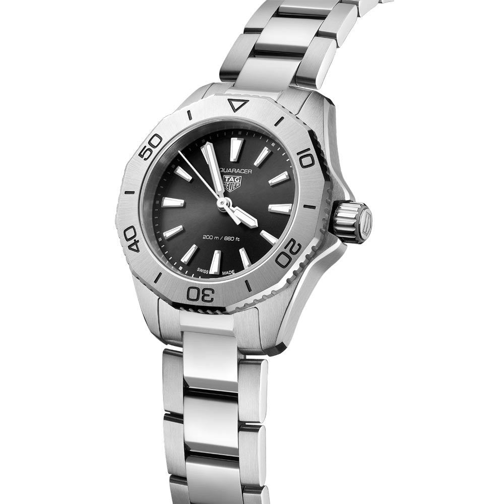 The TAG Heuer Aquaracer boasts a 30mm steel construction. melding elegant style with technical sophistication and uncompromising engineering. This watch will become an indispensable companion when you strive to reach your goals.
