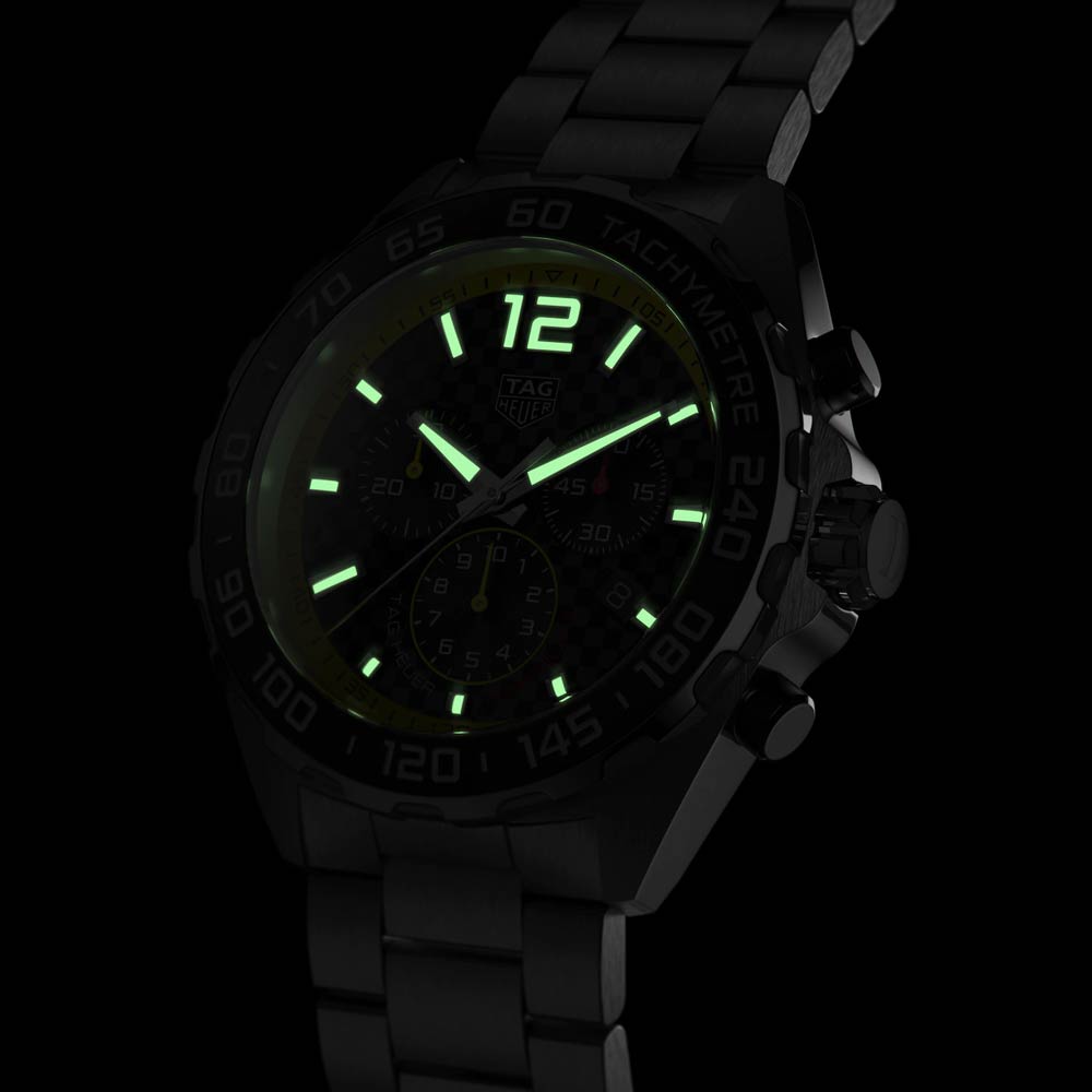 This motor-sports essential boasts a sleek. daring design featuring carbon fiber-textured midnight dial and 60 second/minute scale flange and bright contrasting yellow central hand tip. Perfect for maintaining the speed and staying ahead of the competition. this watch is the ideal choice for the avid pilot.