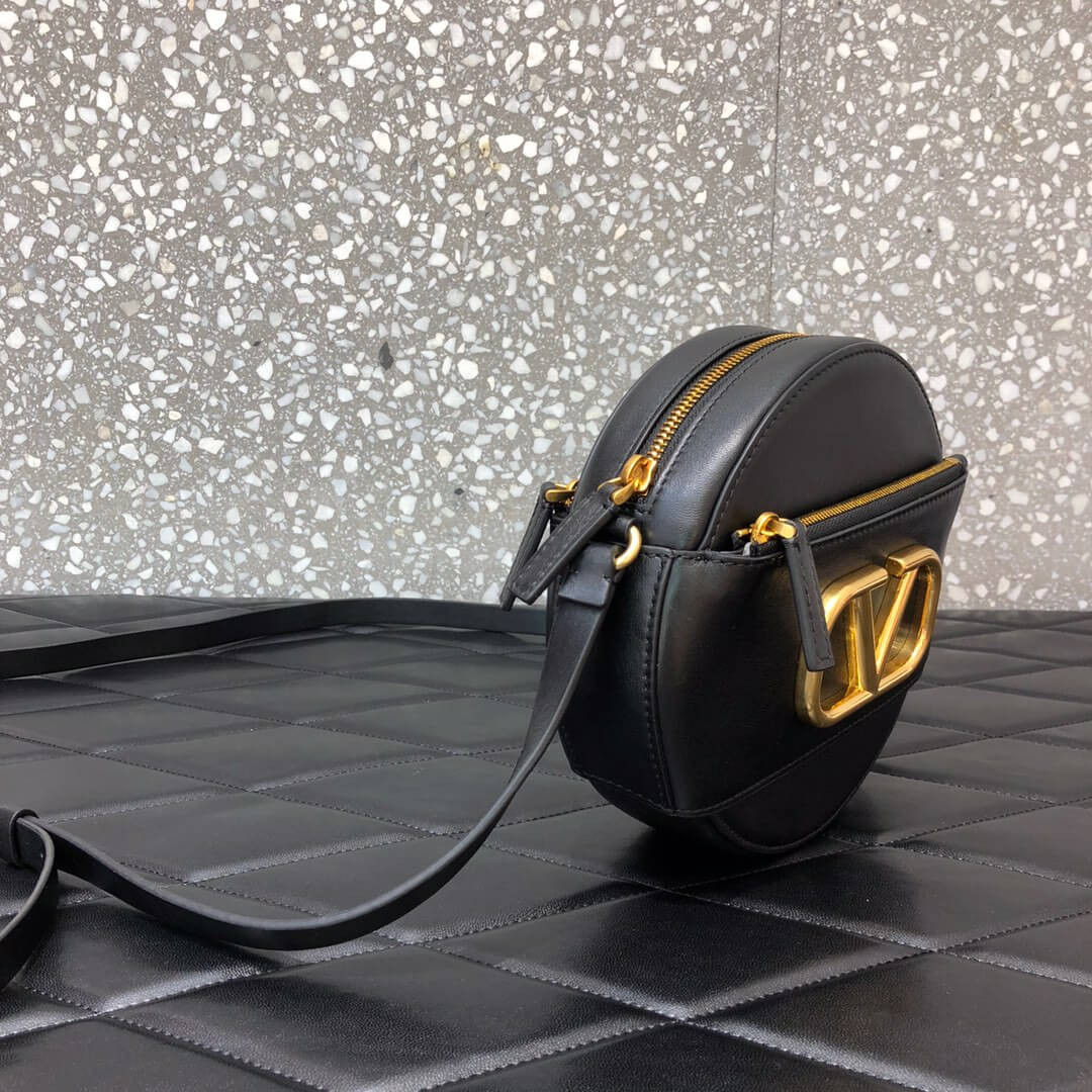 Embellished with an updated logo hardware design, this circular leather crossbody bag exudes understated elegance.