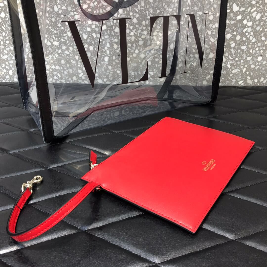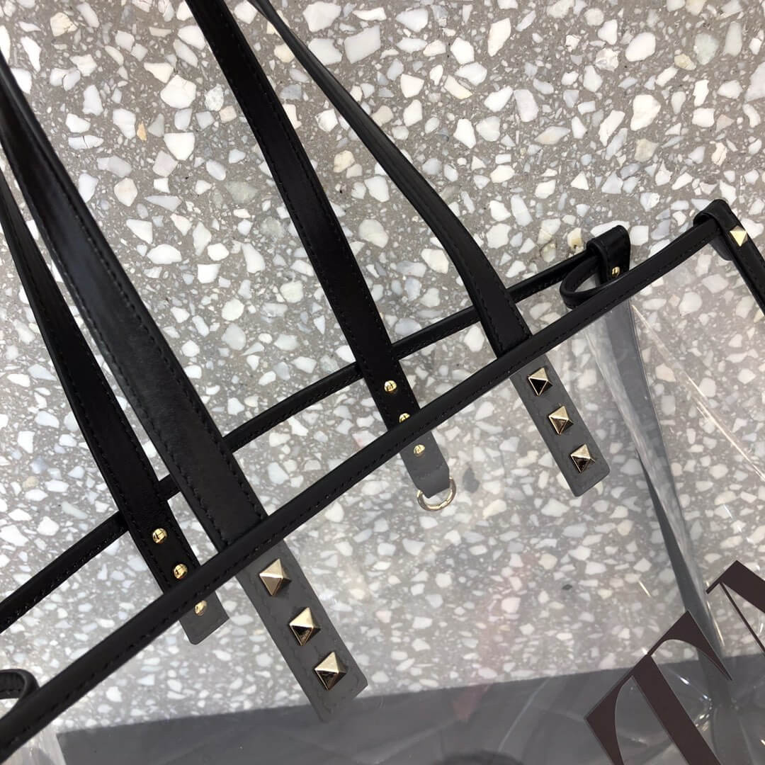 Embellished with the house's dark silvertone signature pyramid studs, Valentino Garavani's clear PVC Grande Plage small tote is trimmed with black leather. The classic silhouette features a visible red leather zip pouch at the interior.
