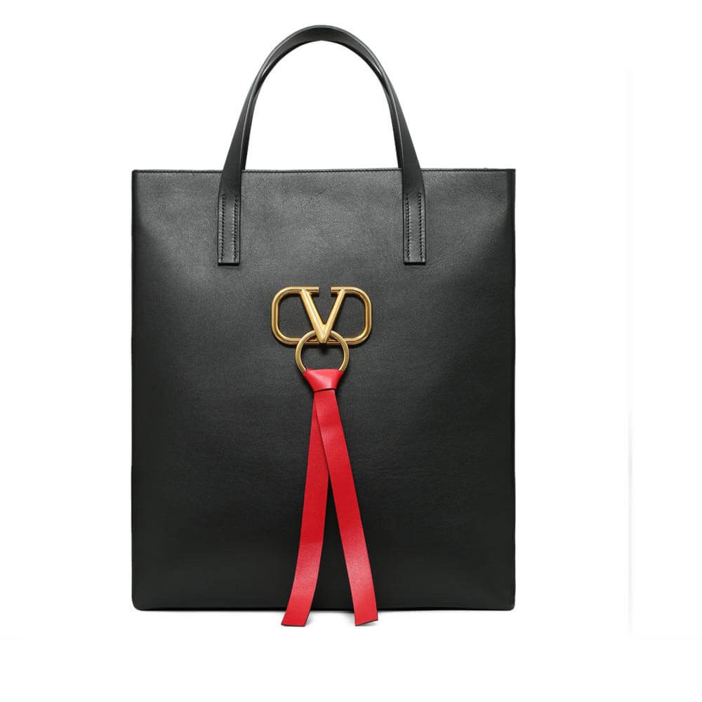 Valentino Garavani N/S VRING calfskin shopper. This bag features a metal logo, adorned with a ring and tie.