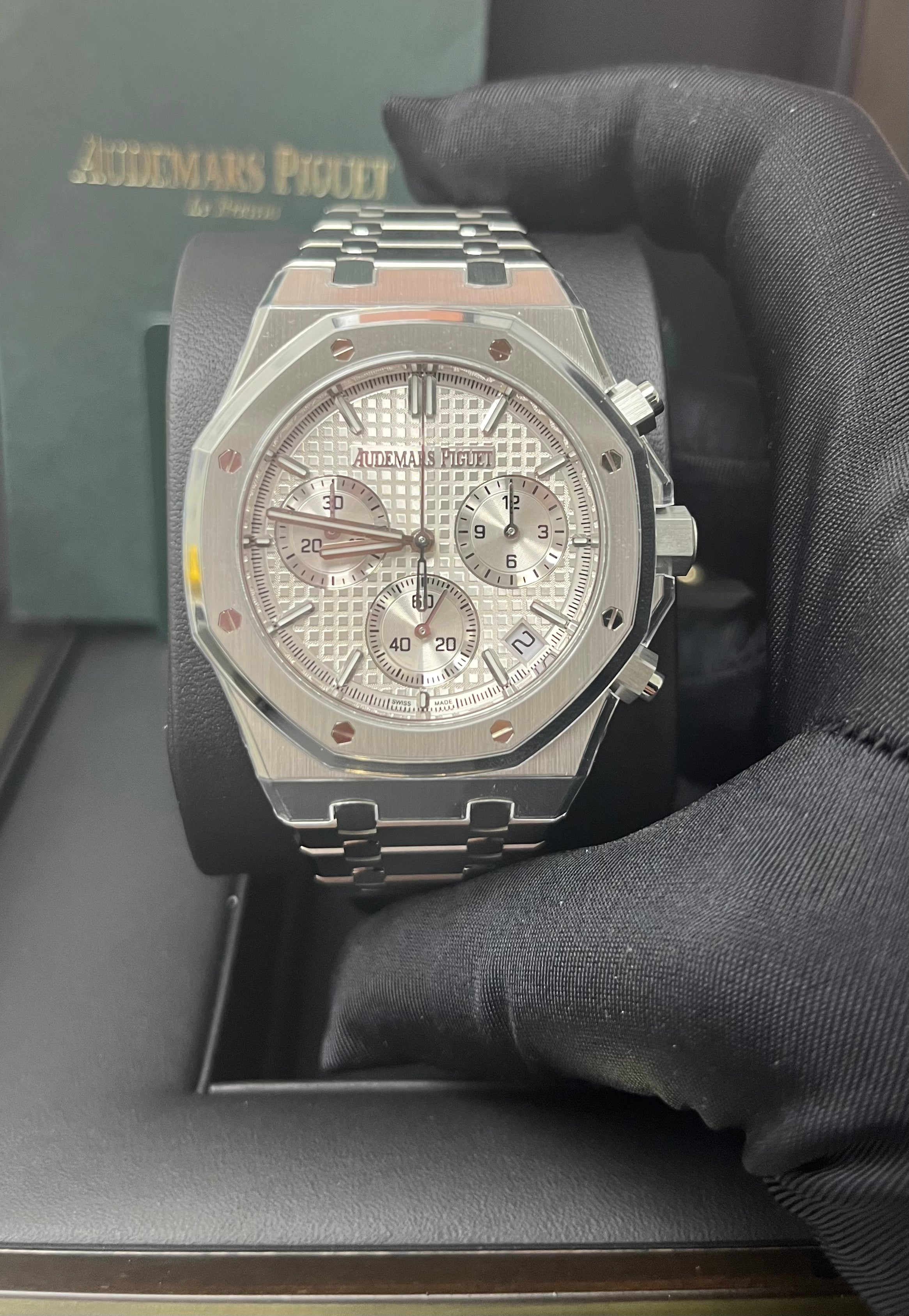 This 41 mm stainless steel Selfwinding Chronograph is adorned with a silver-toned “Grande Tapisserie�?dial which nicely complements the watch's slenderer aesthetic bestowed by the latest Royal Oak design evolution.Stainless steel case. glareproofed sapphire crystal and caseback. screw-locked crown.Silver-toned dial with “Grande Tapisserie�?pattern. silver-toned counters. white gold applied hour-markers and Royal Oak hands with luminescent coating.