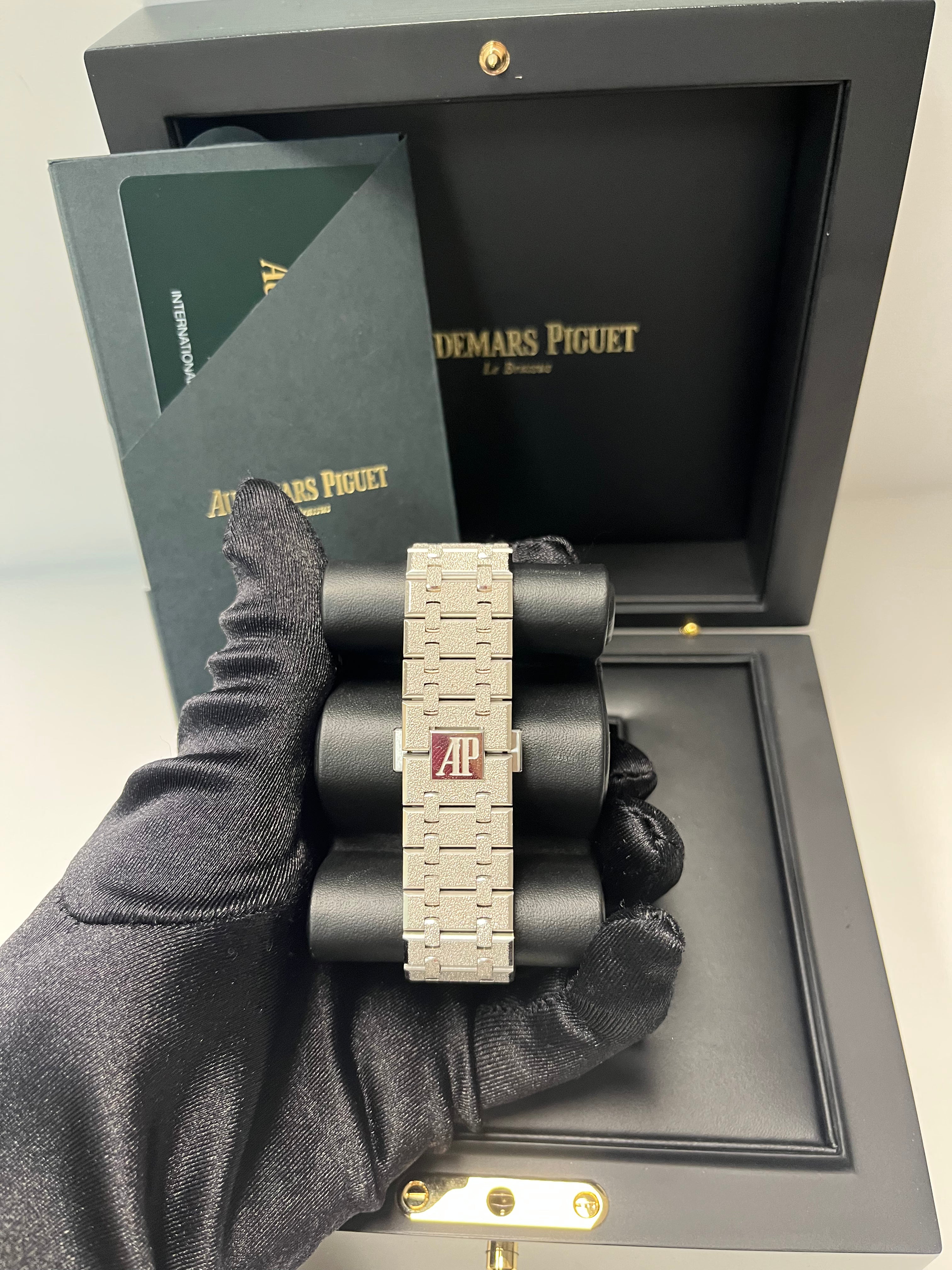 The 18-carat white gold case and bracelet glittering with Frosted Gold are contrasted with a contemporary black “Grande Tapisserie�?dial illuminated with rhodium-toned counters. Hammered 18-carat white gold case. glareproofed sapphire crystal and caseback. screw-locked crown.Black dial with “Grande Tapisserie�?pattern. rhodium-toned counters. white gold applied hour-markers and Royal Oak hands with luminescent coating. Hammered 18-carat white gold bracelet with AP folding clasp.