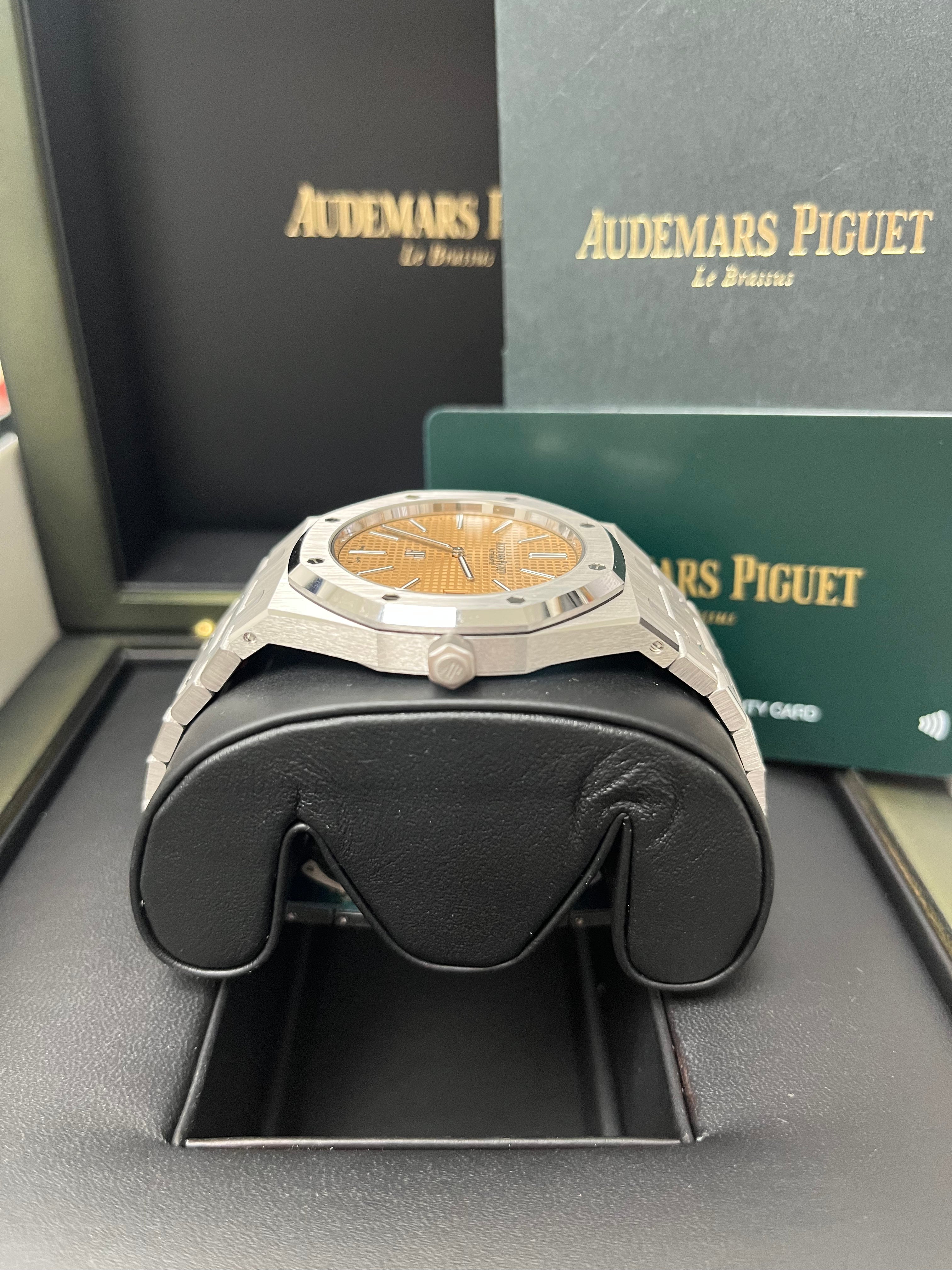 The pink gold-toned “Petite Tapisserie�?dial that appeared for the Royal Oak's 20th anniversary in 1992 is matched for the first time with an 18-carat white gold case and bracelet. 18-carat white gold case. glareproofed sapphire crystal and caseback.Pink gold-toned dial with “Petite Tapisserie�?pattern. white gold applied hour-markers and Royal Oak hands with luminescent coating. 18-carat white gold bracelet with AP folding clasp.