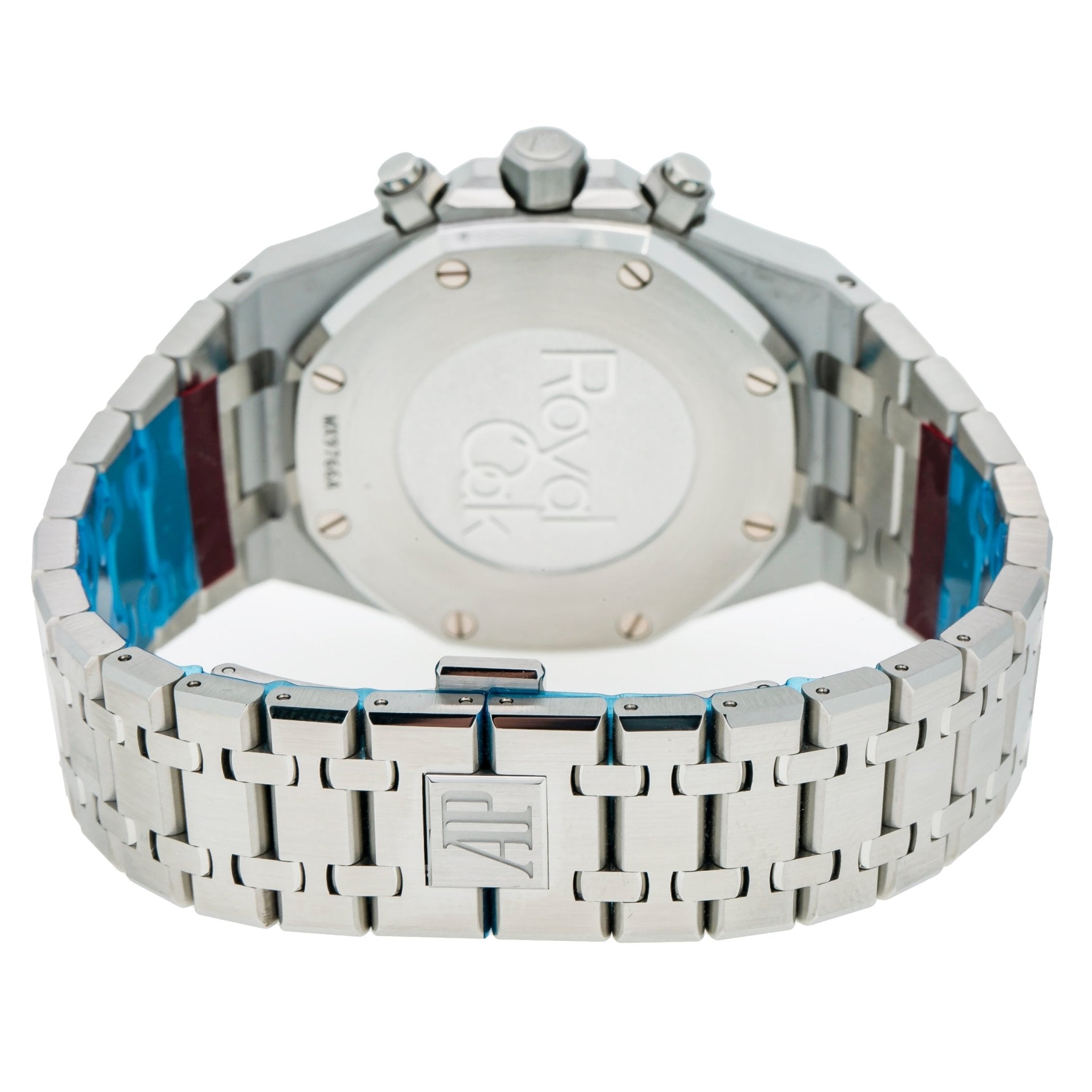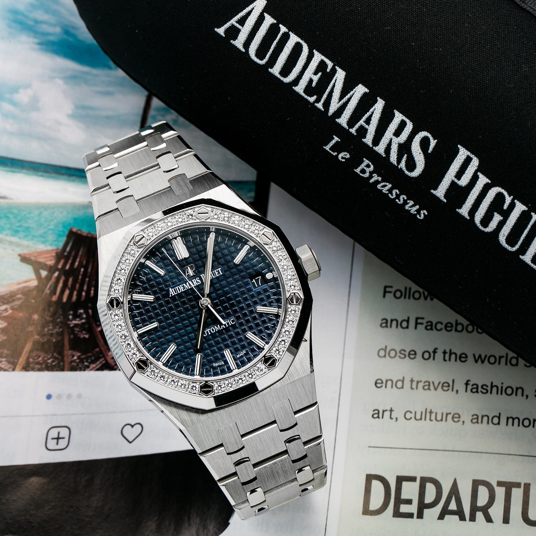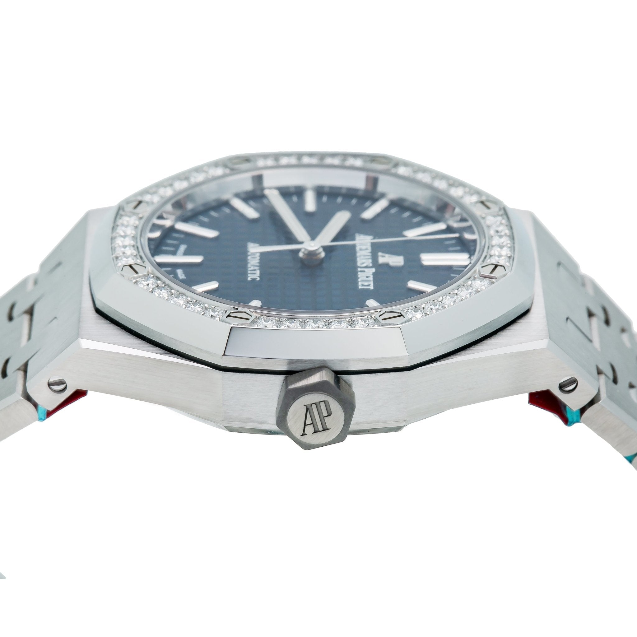 37mm stainless steel case. 9.8 mm thick. glare-proof sapphire crystal back. diamond-set bezel. glare-proof sapphire crystal. blue dial with Grande Tapisserie�?pattern. white gold applied hour-markers and Royal Oak hands with luminescent coating. Calibre 3120 self-winding movement with dive-time measurement. hours. minutes. center seconds and date. approximately 60 hours of power reserve. stainless steel bracelet.