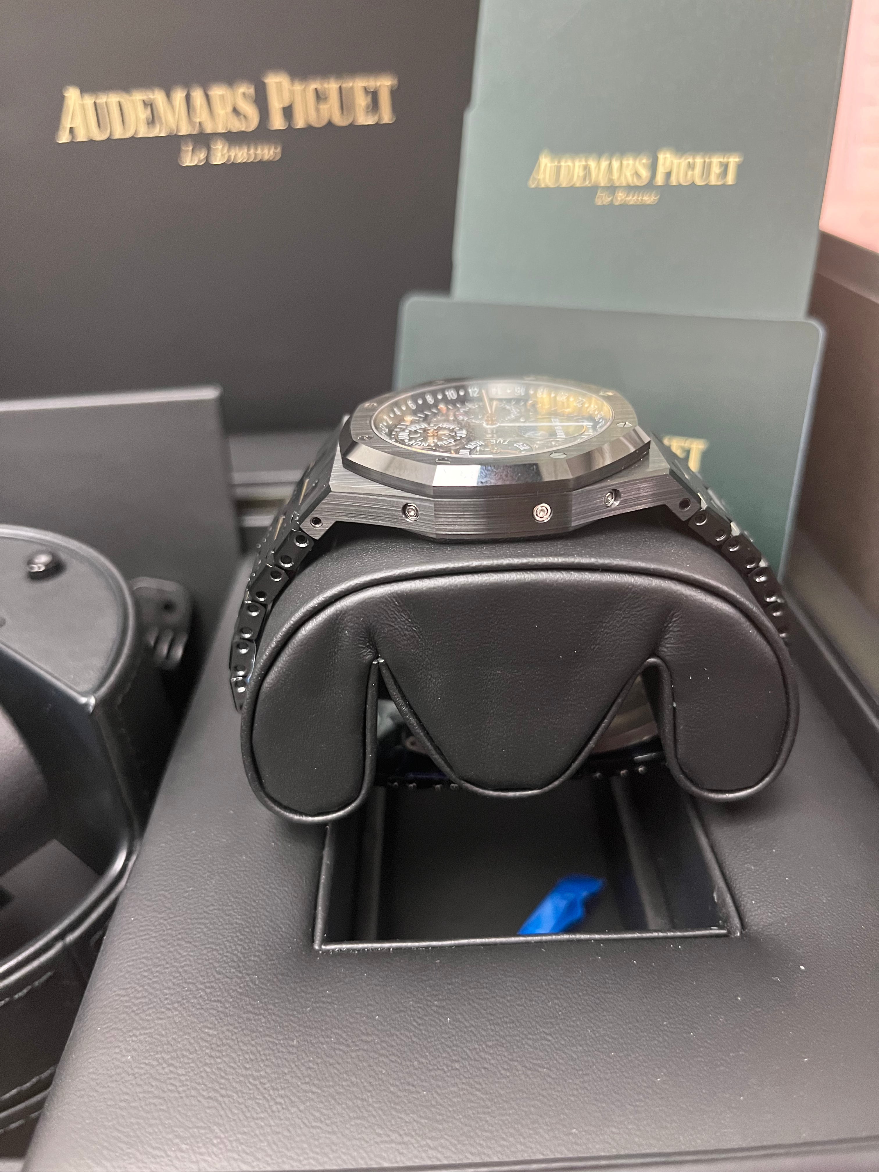 A feat of technical mastery. the Royal Oak Perpetual Calendar Openworked dresses the artistic openworked sapphire dial and the movement's visible pink gold components in black ceramics. Black ceramic case. glareproofed sapphire crystal and black ceramic caseback. screw-locked crown. Sapphire dial. smoked external zone of the counters. pink gold applied hour-markers and Royal Oak hands with luminescent coating. black inner bezel. Black ceramic bracelet with titanium AP folding clasp.