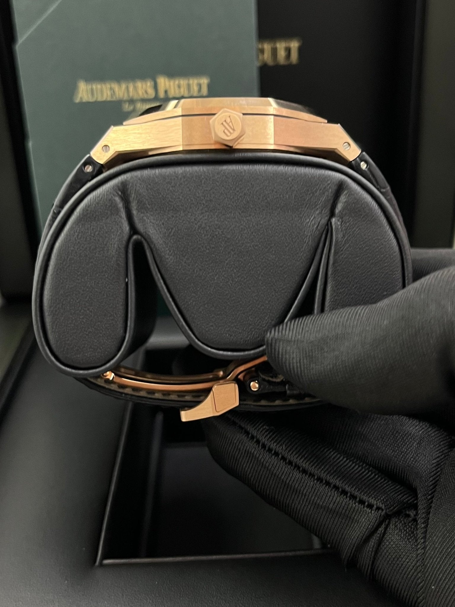 This 18-carat pink gold Royal Oak Selfwinding in 41 mm is endowed with the new design evolution and sports a black Grande Tapisserie dial and a matching alligator strap. 18-carat pink gold case. glareproofed sapphire crystal and caseback. screw-locked crown. Black dial with “Grande Tapisserie�?pattern. pink gold applied hour-markers and Royal Oak hands with luminescent coating. Black alligator strap with 18-carat pink gold AP folding clasp.