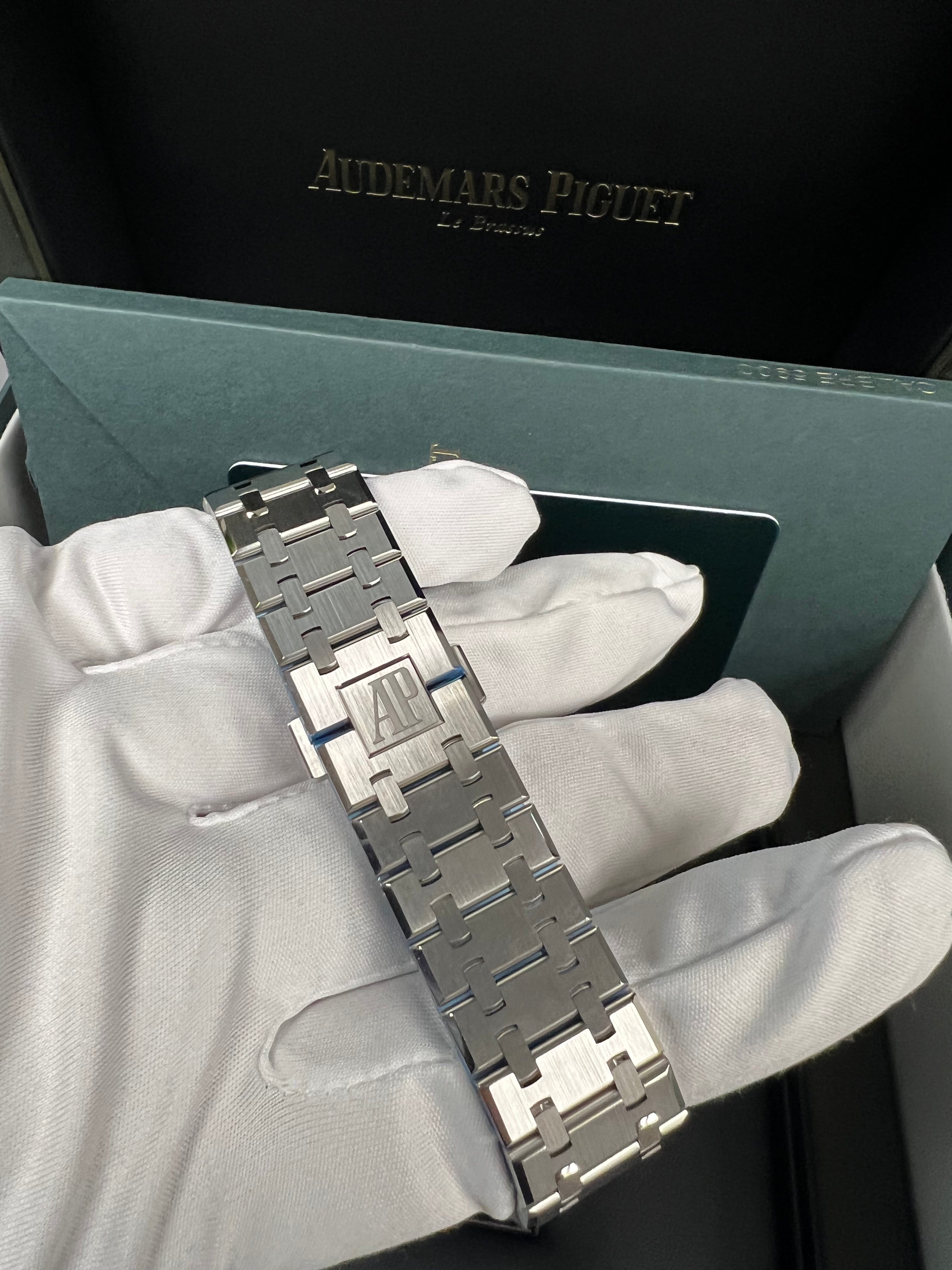 CASE MATERIAL Steel WATER RESISTANCE 50 m SIZE 41 mm THICKNESS 10.5 mm DIAL Silver-toned dial with “Grande Tapisserie�?pattern. white gold applied hour-markers and Royal Oak hands with luminescent coating.