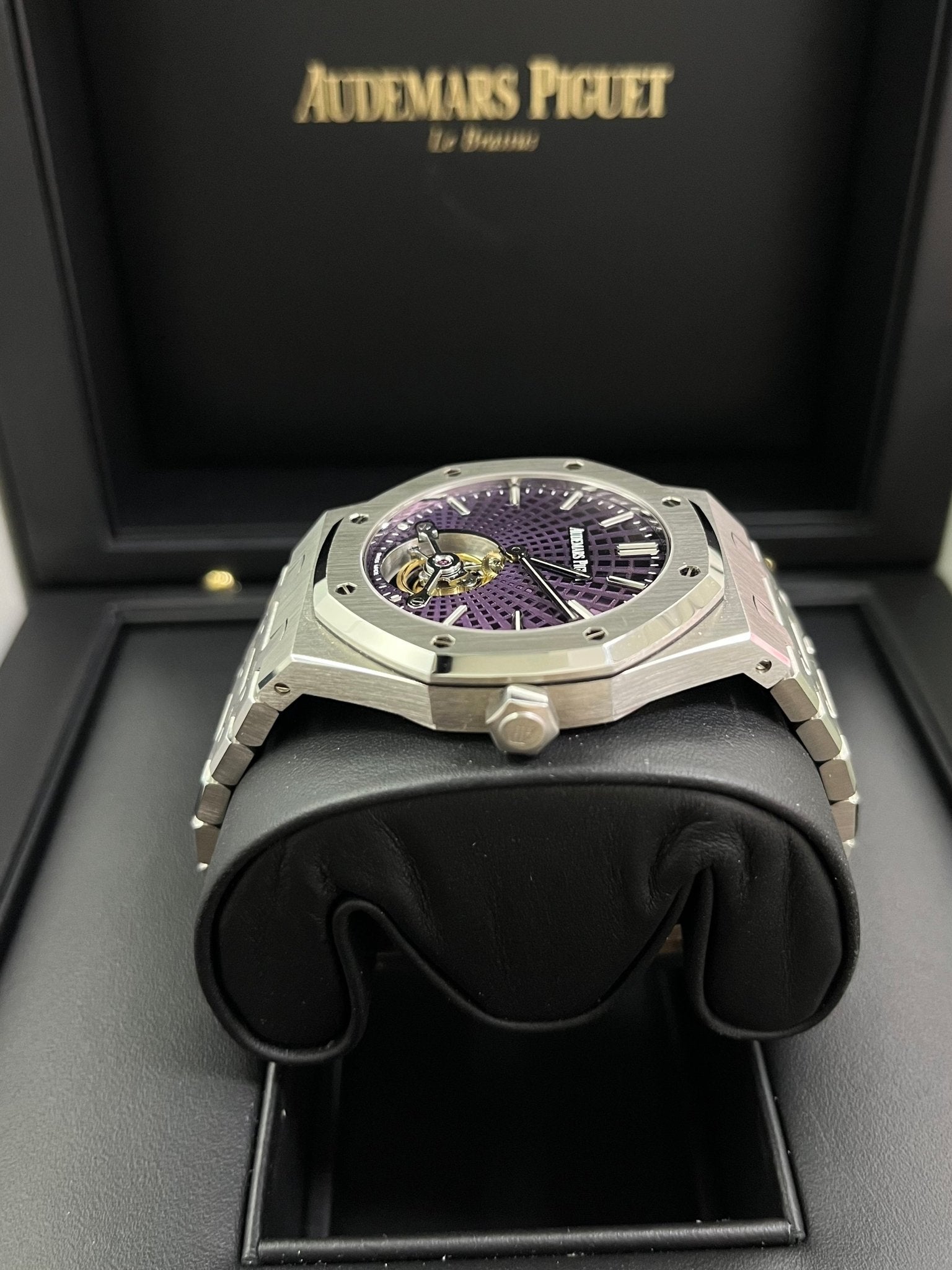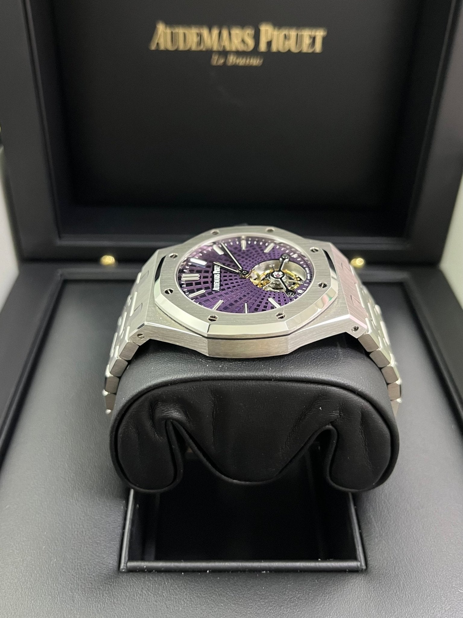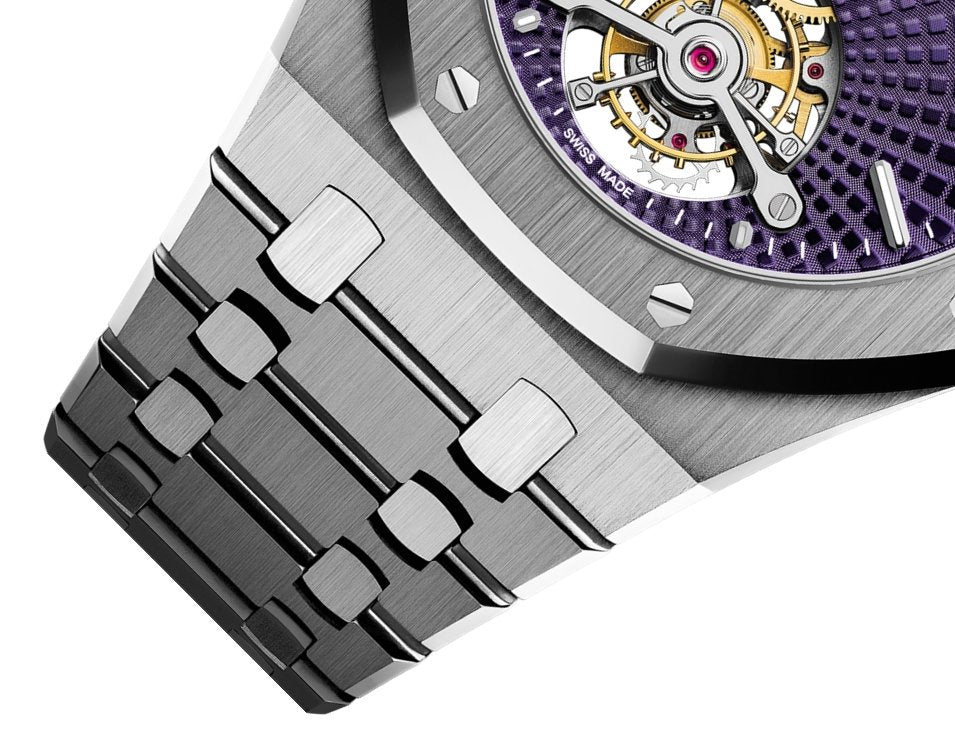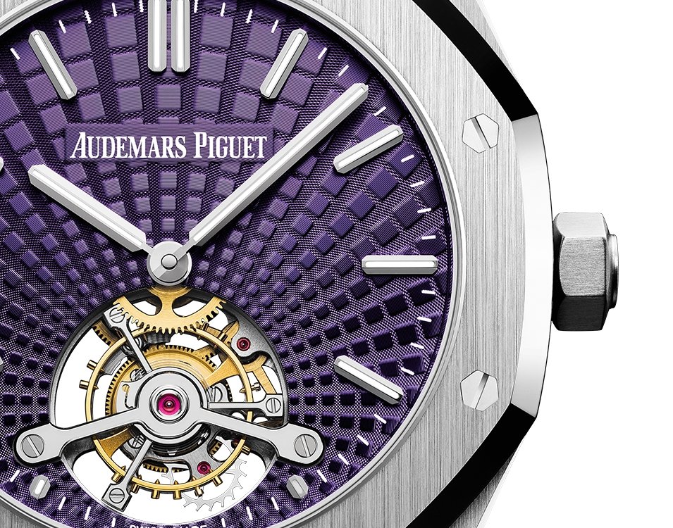 Purple dial with “Tapisserie Evolutive�?pattern. white gold applied hour-markers and Royal Oak hands with luminescent coating. BRACELET