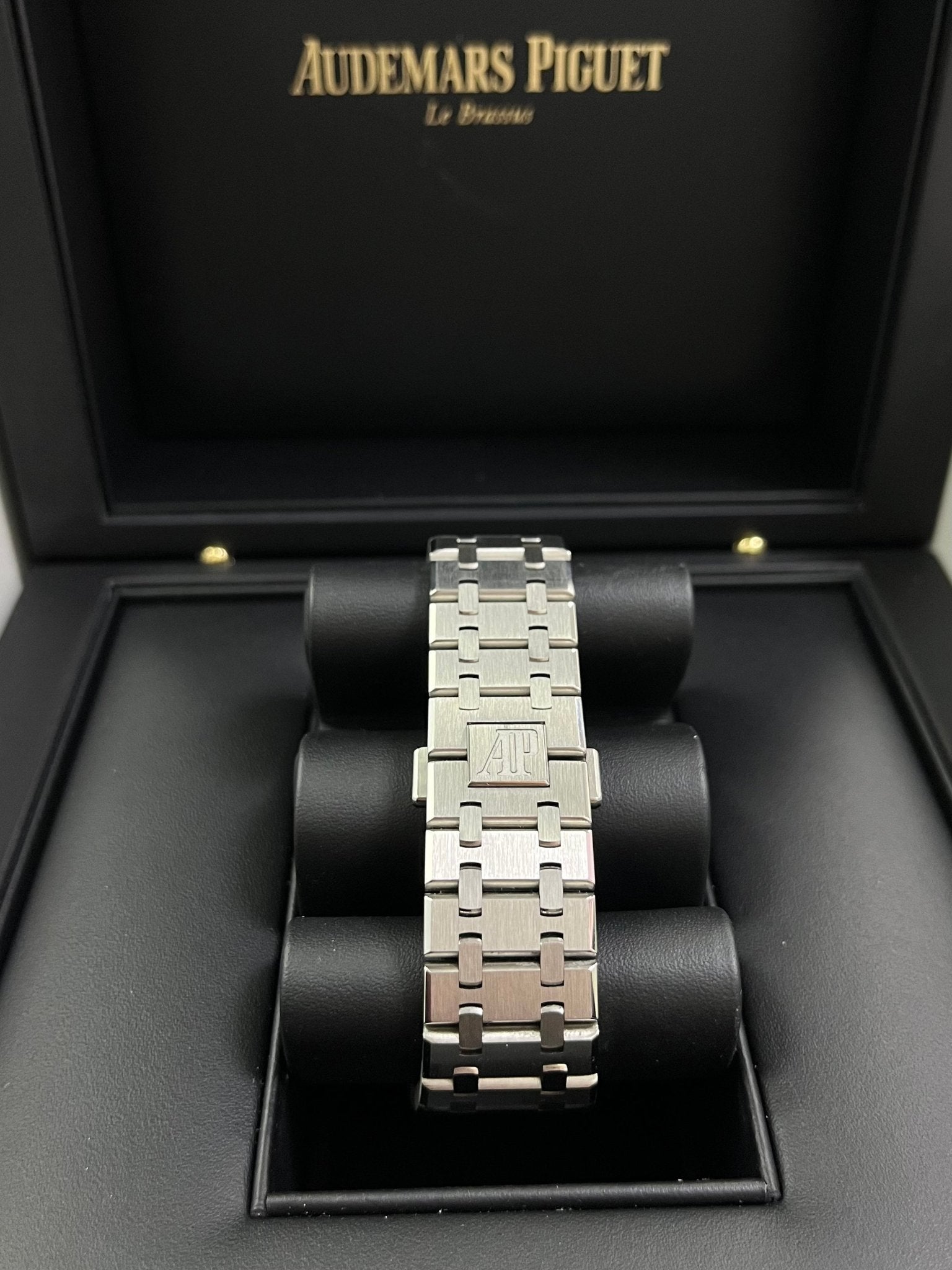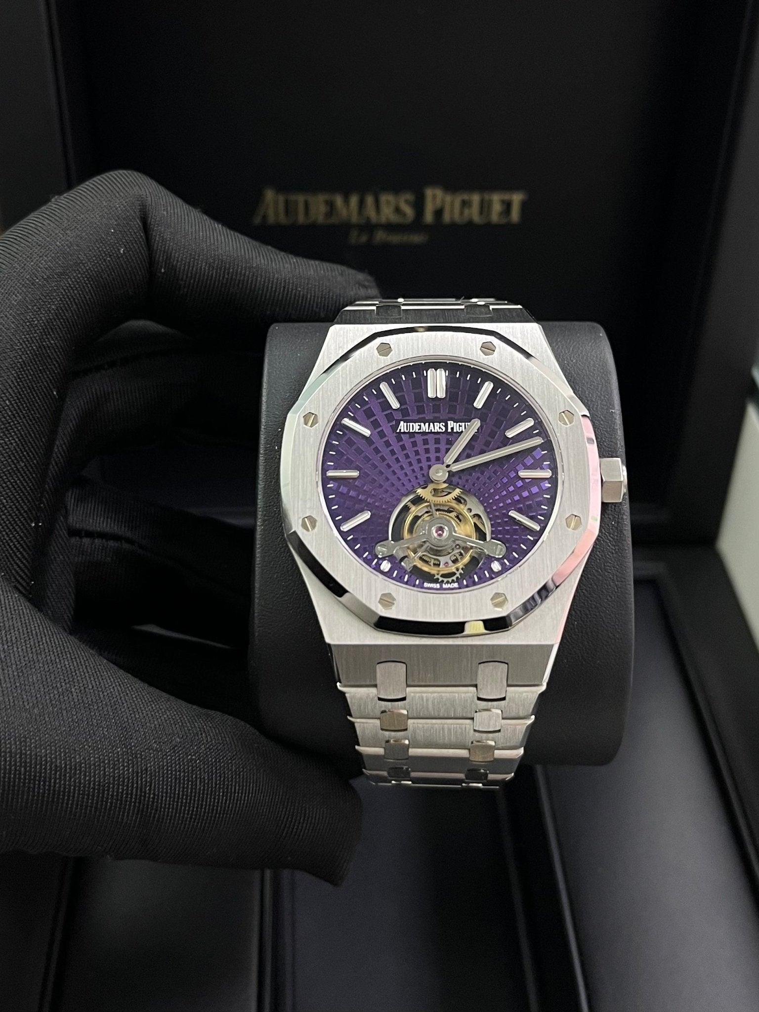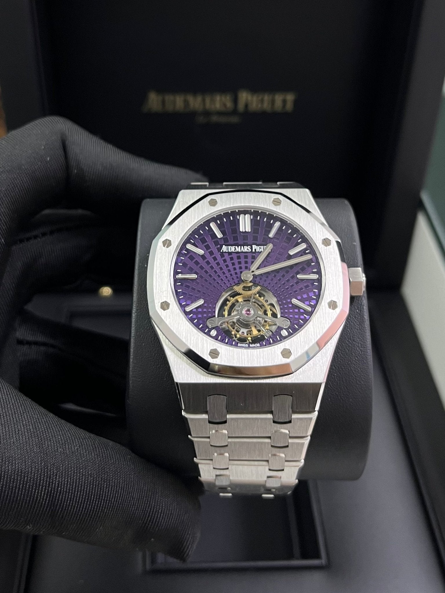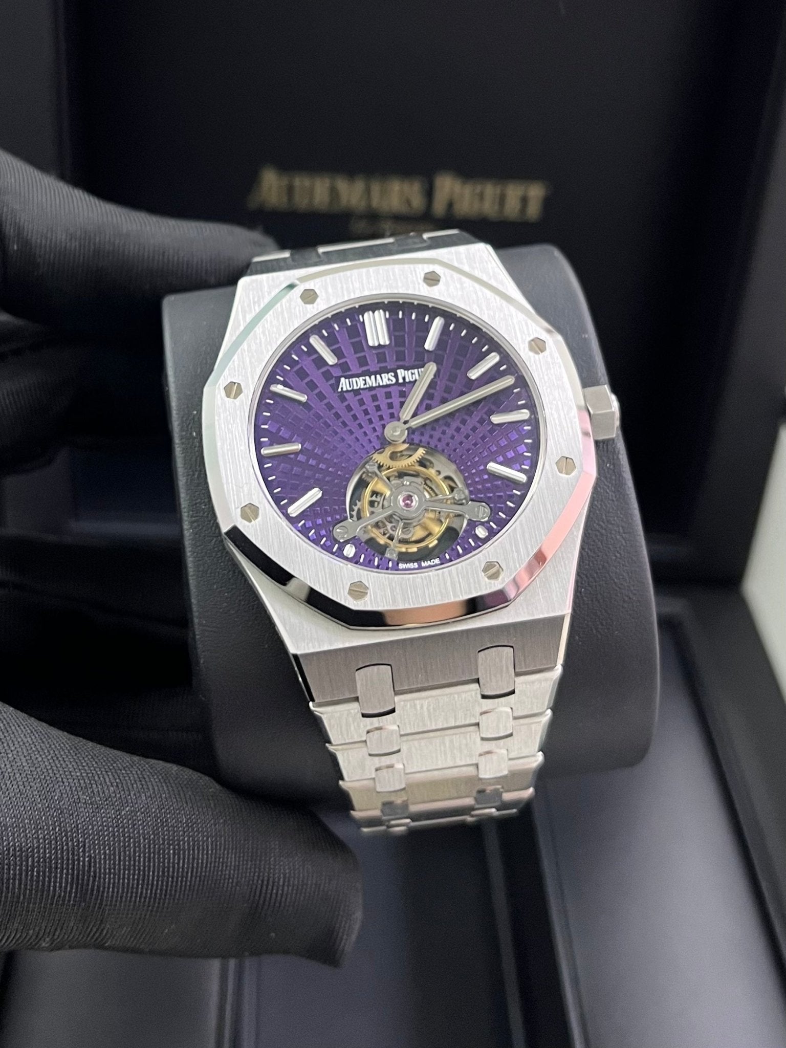 Purple dial with “Tapisserie Evolutive�?pattern. white gold applied hour-markers and Royal Oak hands with luminescent coating. BRACELET