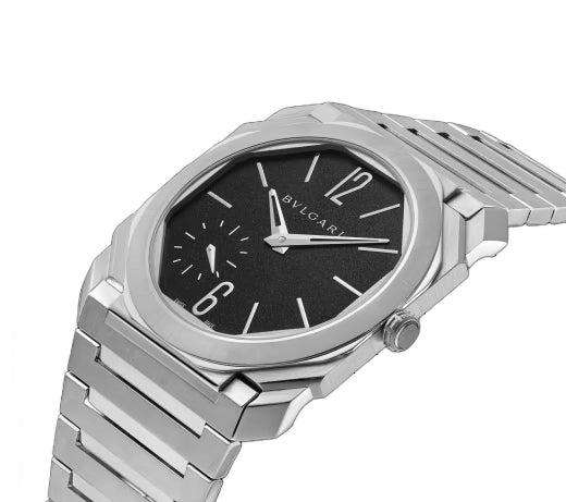 Octo Finissimo Automatic watch with mechanical manufacture movement. automatic winding. platinum microrotor. small seconds. extra-thin satin-polished stainless steel case and bracelet. transparent case back and black matte dial. Water-resistant up to 100 metres