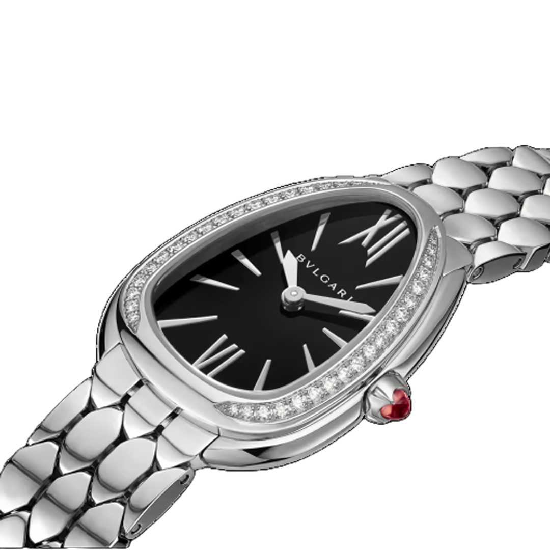 Gleaming with the refined sheen of its materials. the Serpenti Seduttori watch in stainless steel makes time even more precious. Reimagining Bulgari's icon of seduction with a striking new design. the timepiece boasts the distinctive drop-shaped watch head set with diamonds and a black lacquered dial. Inspired by the scales of a serpent. the sensual and flexible bracelet features a hexagonal pattern. conjuring up the glamour of jewellery through a captivating aesthetic.