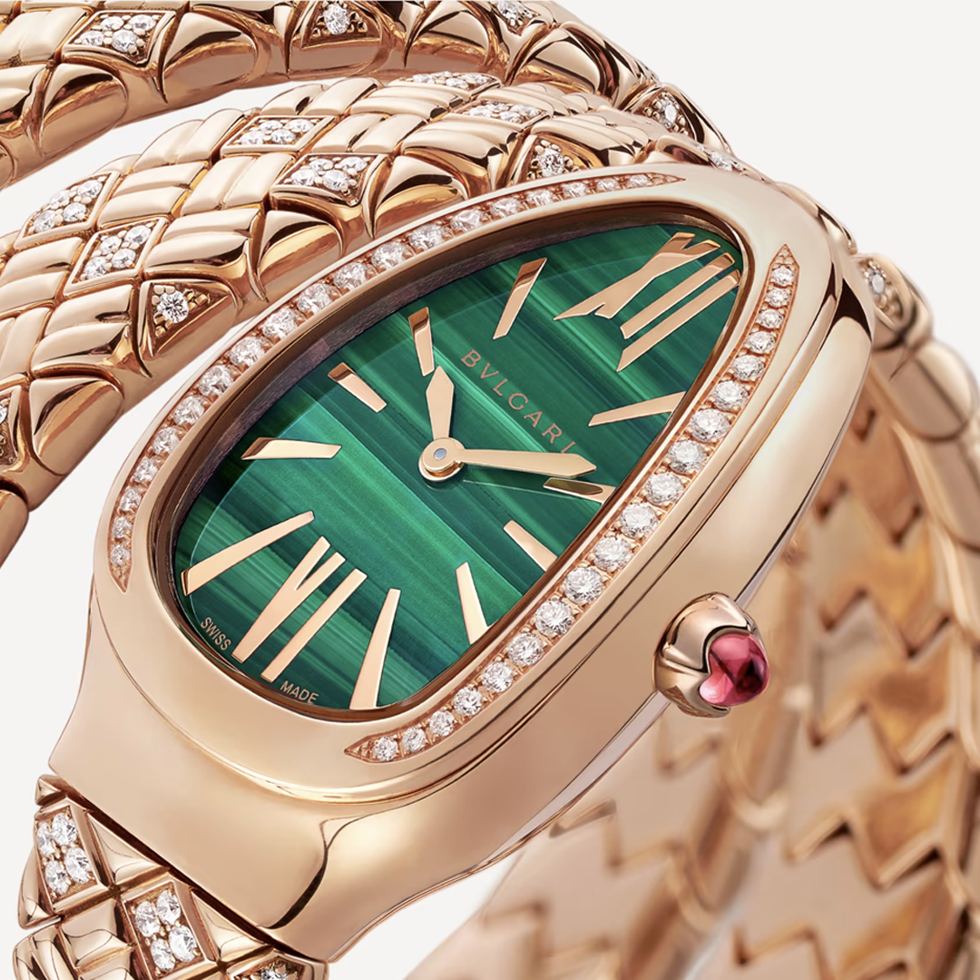 Combining the audacity of Serpenti and the legend of Spiga. the Italian word for spike. the Serpenti Spiga double-spiral watch in 18 kt rose gold embellished with diamonds. fuses the modern with the ancient. Contemporary in design. purely Roman in its deep symbolism. the coiling timepiece echoes the idea of infinity with its abstract wheat stalk pattern carved into the bracelet itself. In a nod to Bulgari's jewellery DNA. the malachite dial captivates with its vibrant green nuances. Large size.