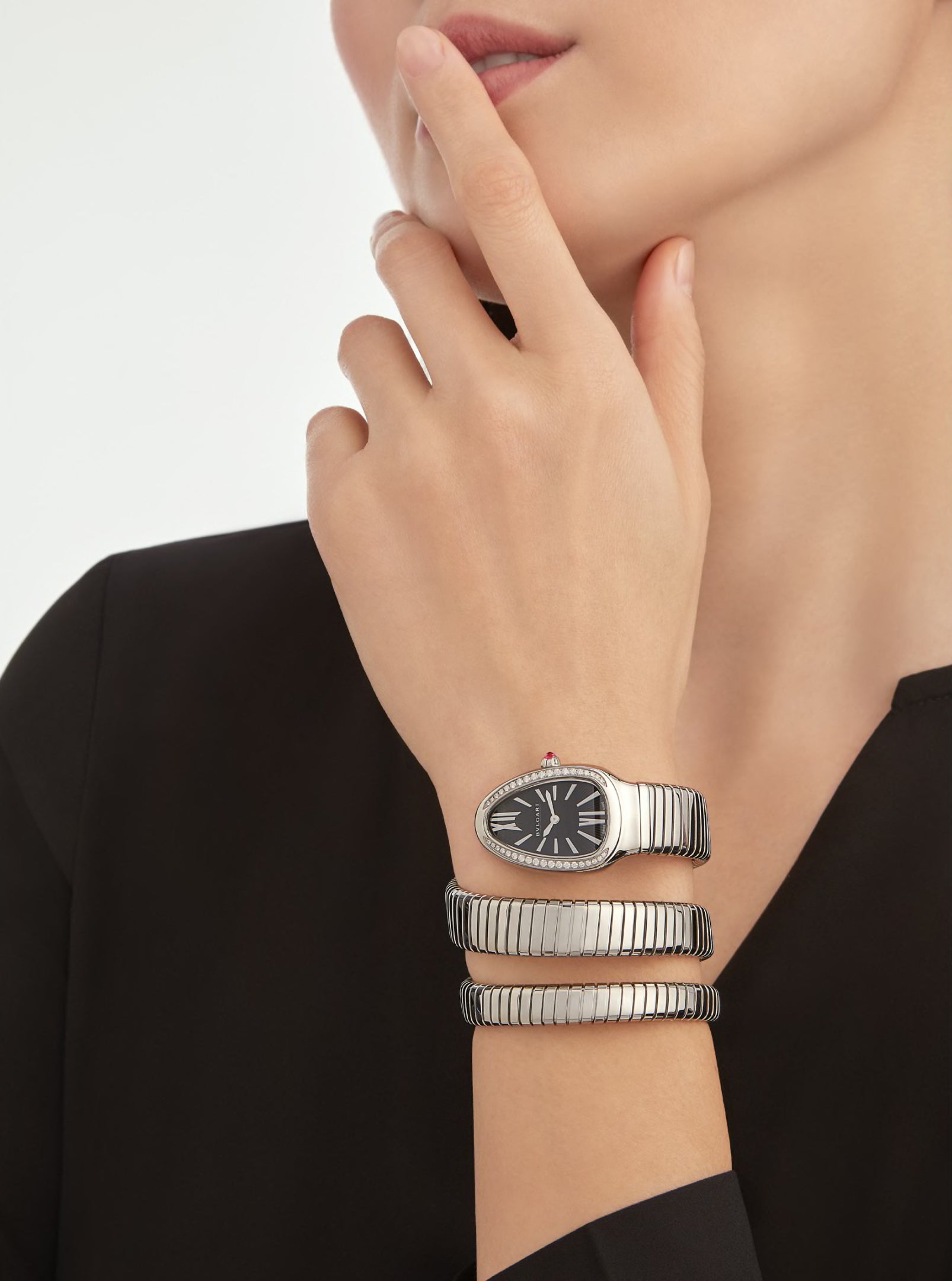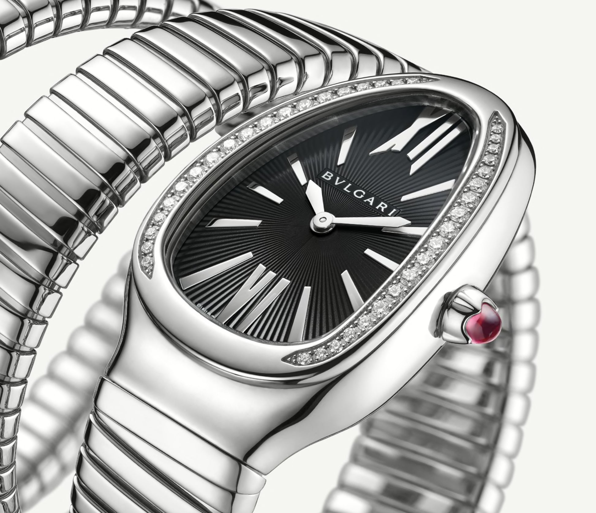 Merging two of the most iconic emblems of Bvlgari design. the Serpenti Tubogas watch coils the sinuosity of the snake with the contemporary soul of tubogas. Crafted with a flexible and tubular litheness. the timepiece evokes both the seductive power of the serpent and the fluid shape of its wrapping body. representing a spellbinding encounter between irresistible glamour and distinctive jewellery design.