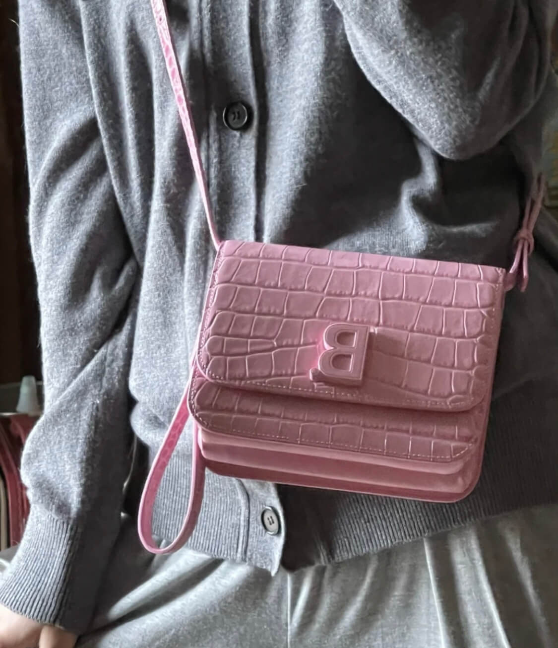 Croc-embossed calfskin shoulder bag. Detachable and adjustable shoulder strap with pin-buckle fastening. Logo hardware at face. Patch pocket at back face. Foldover flap with turn-lock fastening. Embossed logo, zippered pocket, and two patch pockets at two-compartment interior. Buffed leather lining in black. Silver-tone hardware.