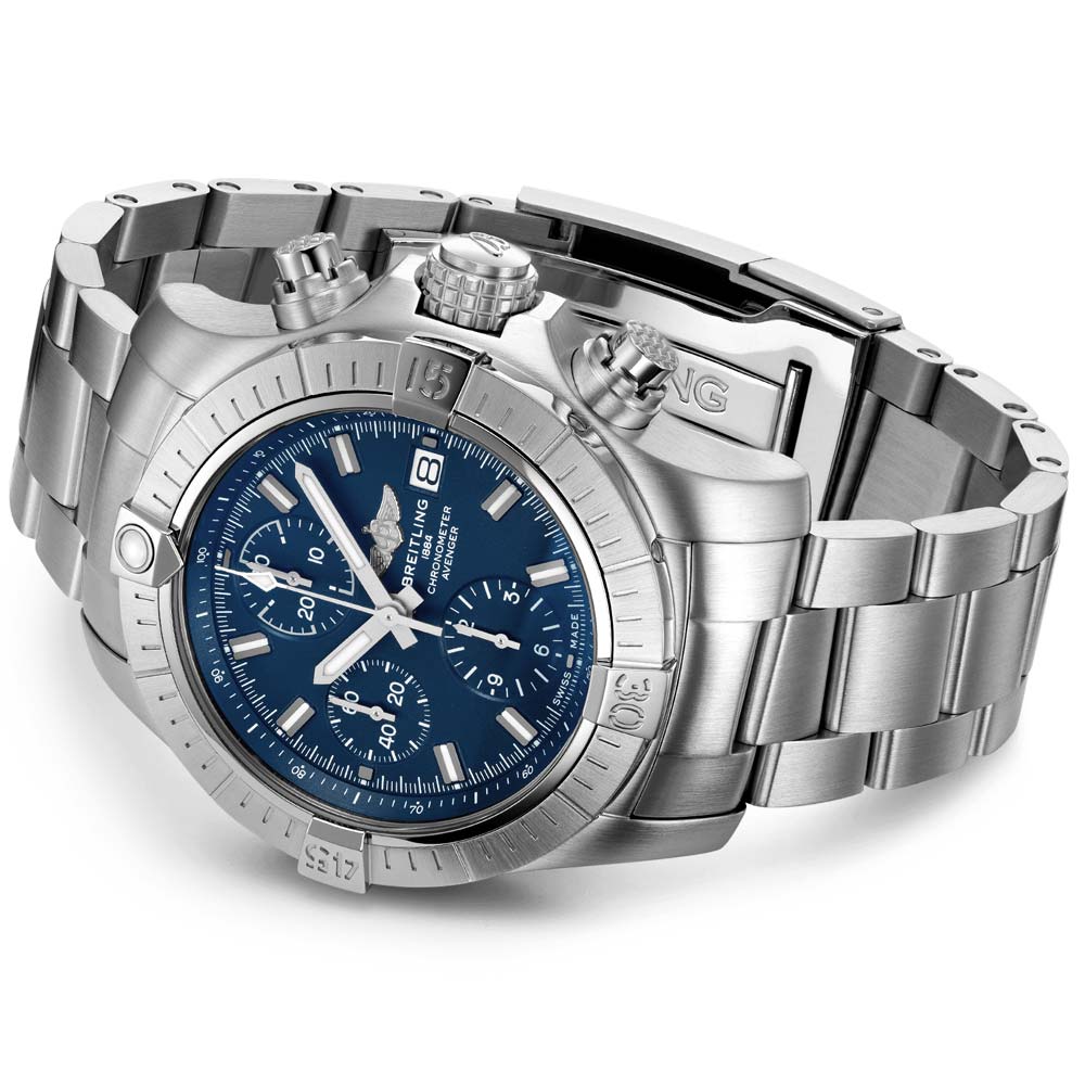 The Avenger Chronograph 43 is the most versatile and compact of its kind. boasting a bold and robust design that is shock-resistant. As a genuine Breitling Avenger. it can be handled even when wearing gloves and provides unparalleled safety and dependability for airborne adventurers. The watch includes a 43mm stainless-steel case. along with a black or blue dial. and has a choice of a stainless-steel bracelet or matching black or blue military leather strap that attaches to either a stainless-steel pin buckle or folding clasp. The grooved bezel and special grip-pattern on the crown and chronograph pushers make the Avenger Chronograph 43 proficient and easy to use with gloves.