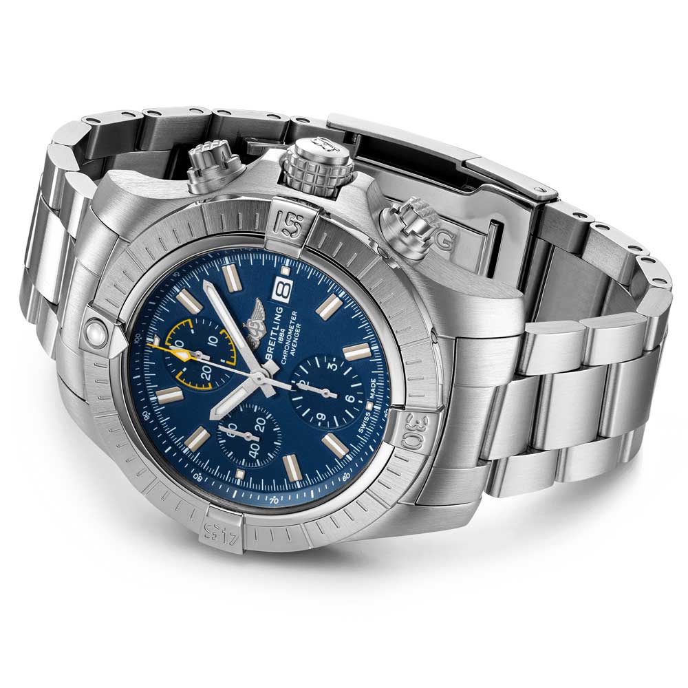 Boasting extreme sturdiness and shock resistance. the Breitling Avenger Chronograph 45 offers a precision-crafted. powerful design. It's the perfect companion for airborne adventurer with its reliable and glove-friendly use. The Avenger Chronograph 45 features a 45mm stainless-steel case. along with a choice of black or blue dial and matching black or blue military strap. It's equipped with a stainless-steel pin buckle or folding clasp and features a hardy bezel with a grip-pattern on the crown & chronograph pushers - enabling easy manipulation while wearing gloves.