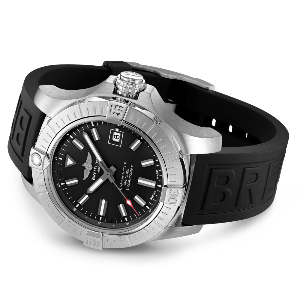 The Avanger Automatic 45 Seawolf is daring and highly durable. granting up to 300 bars of water resistance (3.000m). perfect for daring dives. This exclusive edition is obtainable only in the UK--only 350 copies in existence. Its stainless steel case is accentuated with a black dial and your pick of stainless steel bracelet or black rubber strap with corresponding stainless steel folding clasp. An outstanding water immunity and special grip-pattern on the crown make operating with gloves effortless. It's unrivaled protection and dependability make this pilots' watch perfect for airborne adventurers.