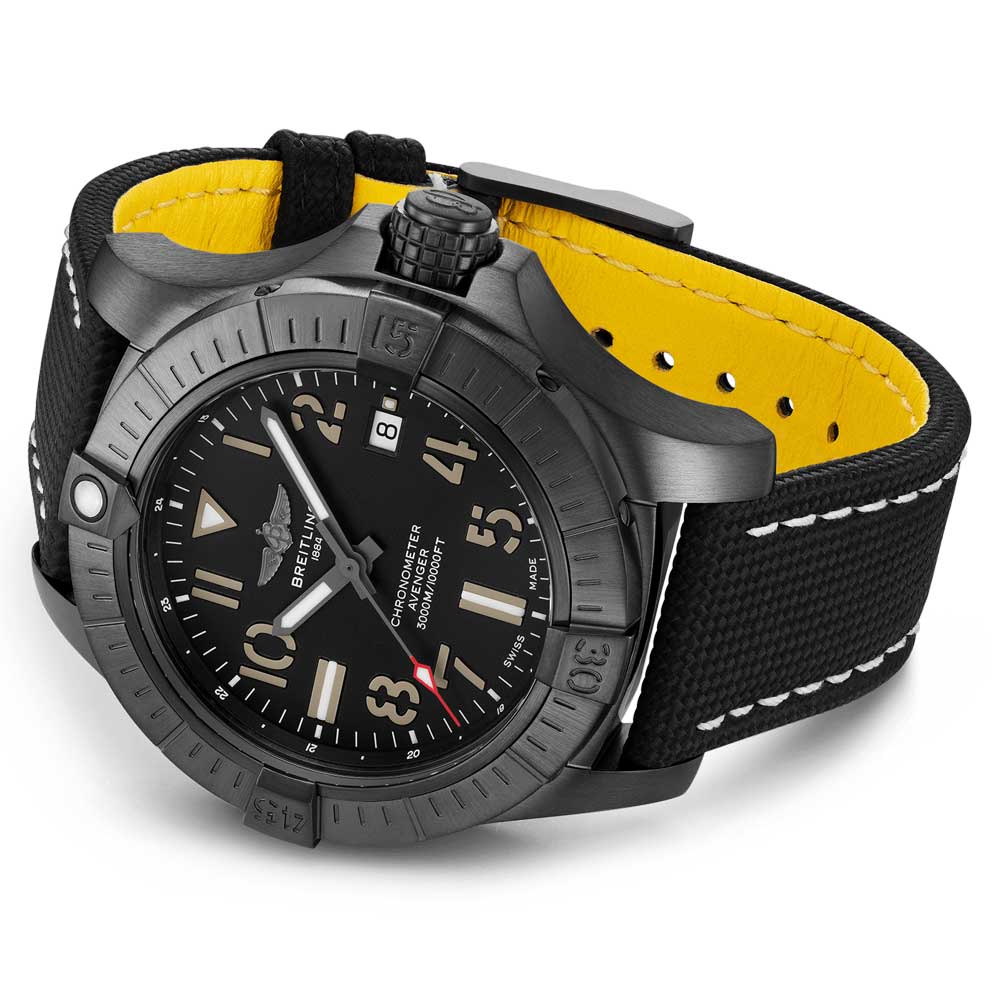 This robust. shock-resistant Breitling Avenger Automatic 45 Seawolf is crafted for deep-sea adventures--up to 3.000 meters. or 300 bars. A lightweight pilot's watch. it offers reliable safety for air travel. even while wearing gloves. Boasting a 45mm DLC-coated titanium case. black dial and a black military leather strap. the Night Mission-interpreted Avenger has unique Arabic numerals to commemorate aircraft carrier decks. Engineered to withstand seawater pressures. this Seawolf watch also features a rugged bezel and textured crown grip. so it can be comfortably and securely operated while gloved.