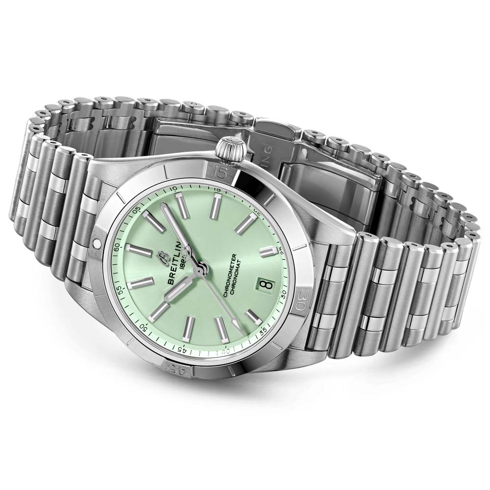 The 36mm Chronomat Automatic blends modern-retro style with several case options. from stainless steel to bicolour to 18ct red gold. Shimmer with diamond bezels. indices. and a range of dial colour options. The Chronomat arrives with Breitling's “Rouleaux�?bracelet and butterfly clasp. and its Calibre 10 movement is certified as a chronometer by the COSC.