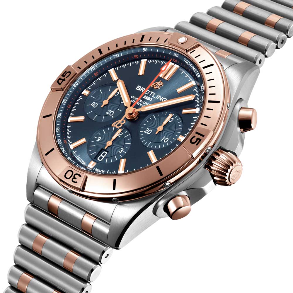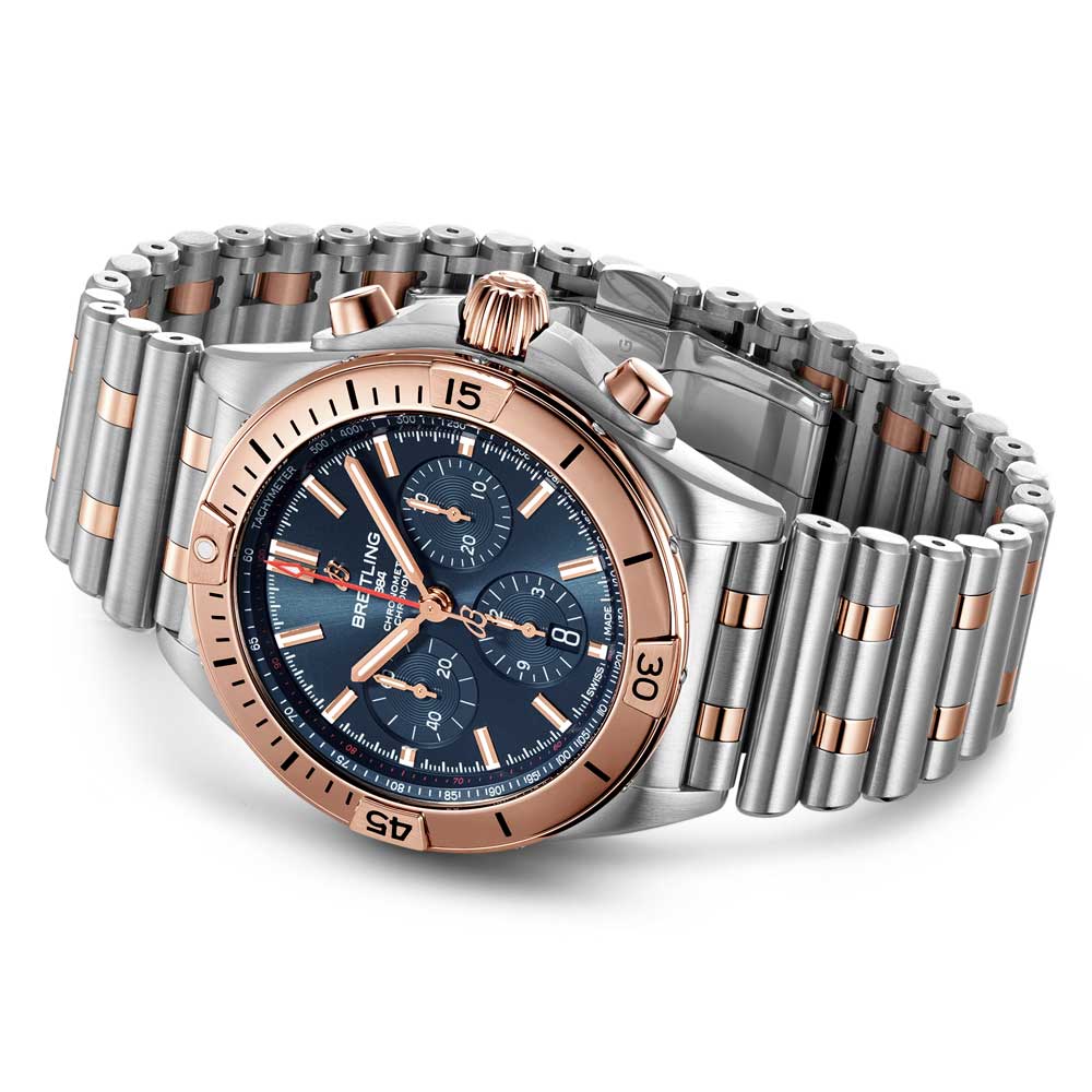 Boasting a range of stainless steel and 18ct rose gold materials. the Chronomat proudly displays its 42 mm case and signature “Rouleaux�?bracelet alongside its iconic four rider tabs bezel. The timepiece is complete with its selection of black. blue. silver and copper dials. as well as its COSC-certified Breitling Manufacture Calibre 01 chronometer.