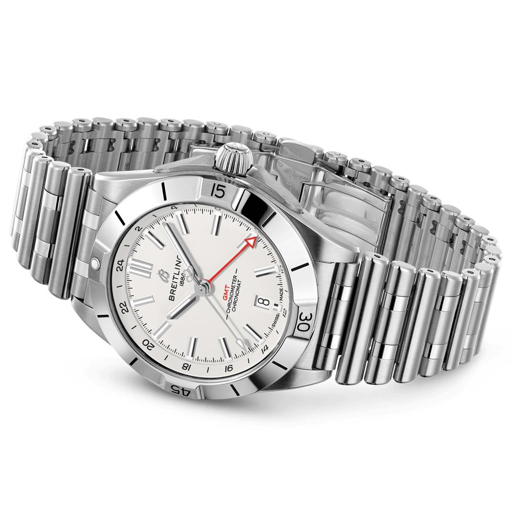 The Chronomat Automatic GMT 40 from Breitling is renowned as an exemplary travel watch. featuring a dual time zone display. stainless steel case and bracelet. and a tone-on-tone 24-hour scale. The bold red GMT hand enhances its stunning visual impact.