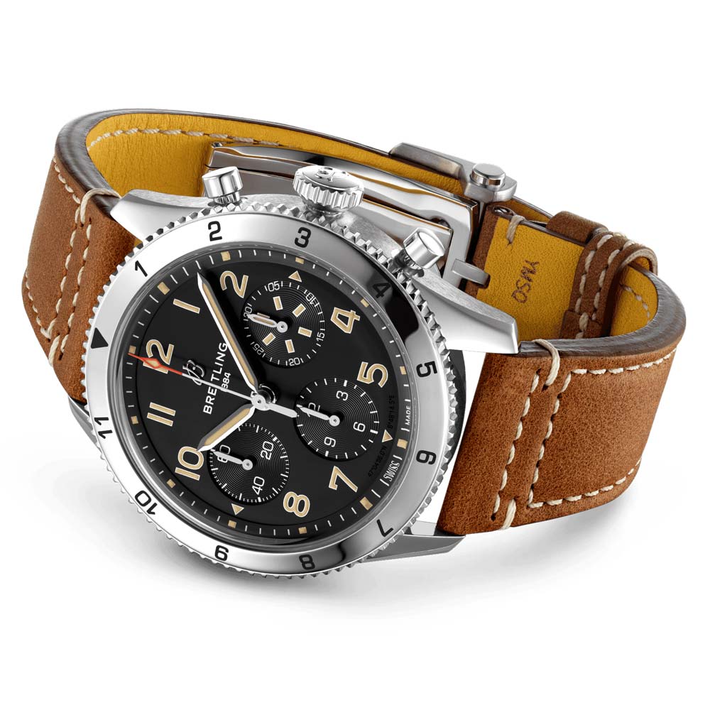 Designed to withstand the challenges of vintage piloting. the Classic AVI P-51 Mustang comes with huge legible Arabic numerals on the dial and bezel. knurled bezel on the 42mm case for improved grip in gloved hands. calfskin straps and a stainless steel bracelet. and COSC-certified Breitling Caliber 23 movement that runs for 48-hours. Perfect for airborne adventurers. the watch provides great readability. comfort. and style.
