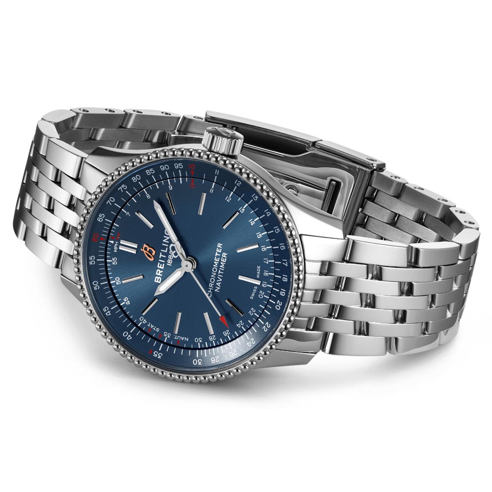 This refined and stylish Automatic 35 Navitimer finds balance between classic design and modern sophistication. Available with an array of material choices. the 35mm case is equipped with a beaded bezel and various sophisticated coloured dials. including diamond-set white mother of pearl. Choose from either a matching bracelet or alligator strap. paired with either a stainless steel pin or folding buckle. All models are powered by Breitling's Calibre 17 COSC-certified chronometer.