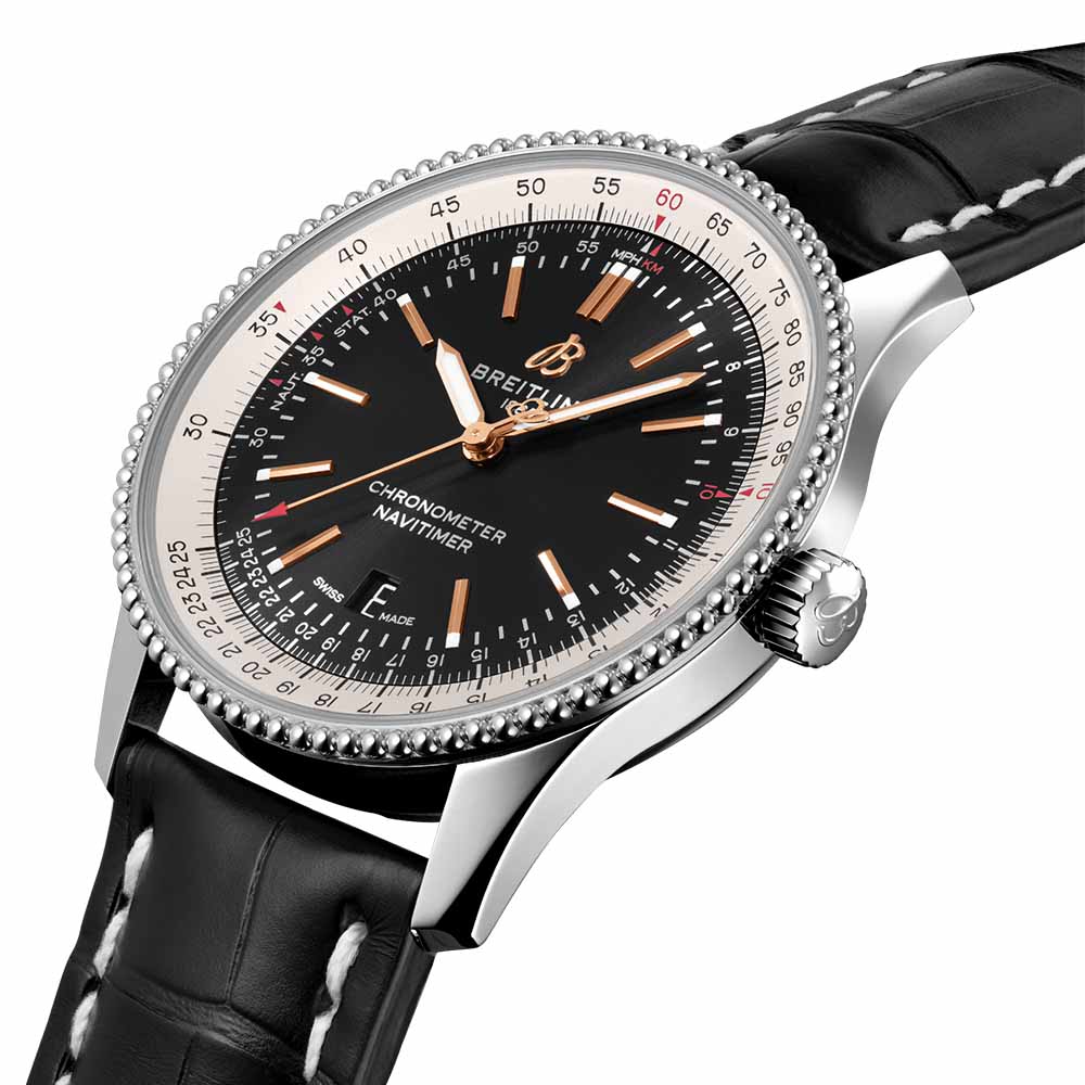 This timepiece perfectly complements the classic appeal of the renowned Navitimer 41 with a modern sophistication. Available in stainless steel or 18ct red gold. the 41mm case is adorned with a beaded bezel and a selection of stylish dial colors. The watch operates with the Breitling Calibre 17. a COSC-certified chronometer. and is fitted with a bracelet or strap complete with a stainless-steel pin or folding buckle.