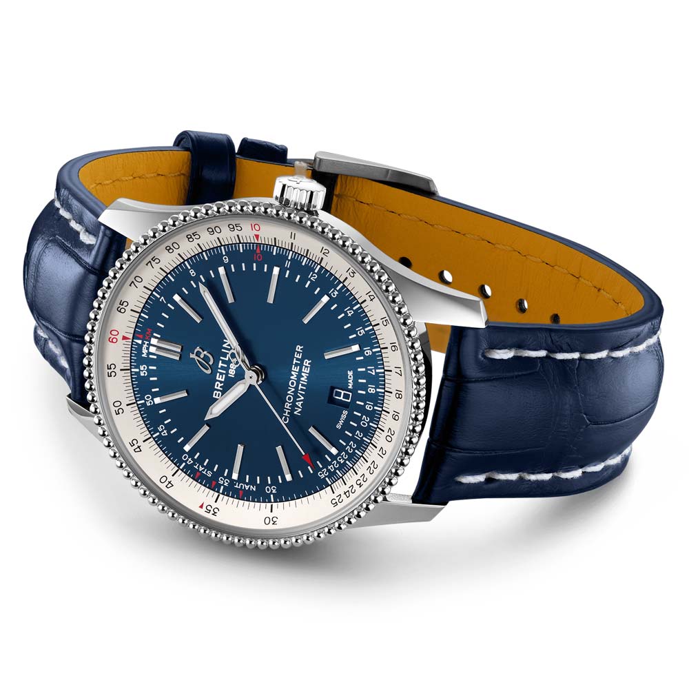 Refined and sophisticated. the Navitimer Automatic 41 pairs the legendary appeal of a classic watch with modern features. Its 41 mm case. crafted using stainless steel or 18ct red gold. sports a beaded bezel and a selection of stylish dial colours. The Navitimer Automatic 41 is also available with a bracelet or alligator strap that accommodates a stainless-steel pin or folding buckle. and is driven by the COSC-certified chronometer. the Breitling Calibre 17.