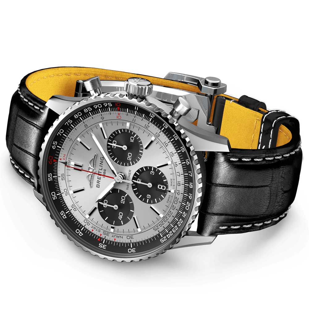 The new Navitimer has classic features. modern refinements. a flattened slide rule and domed crystal for a sleeker profile. polished/brushed metal elements. new dial colours of blue. green and copper. and the return of the AOPA wings to 12 o'clock. For 70 years. this beloved icon has been worn by celebrities. astronauts and aviators alike.
