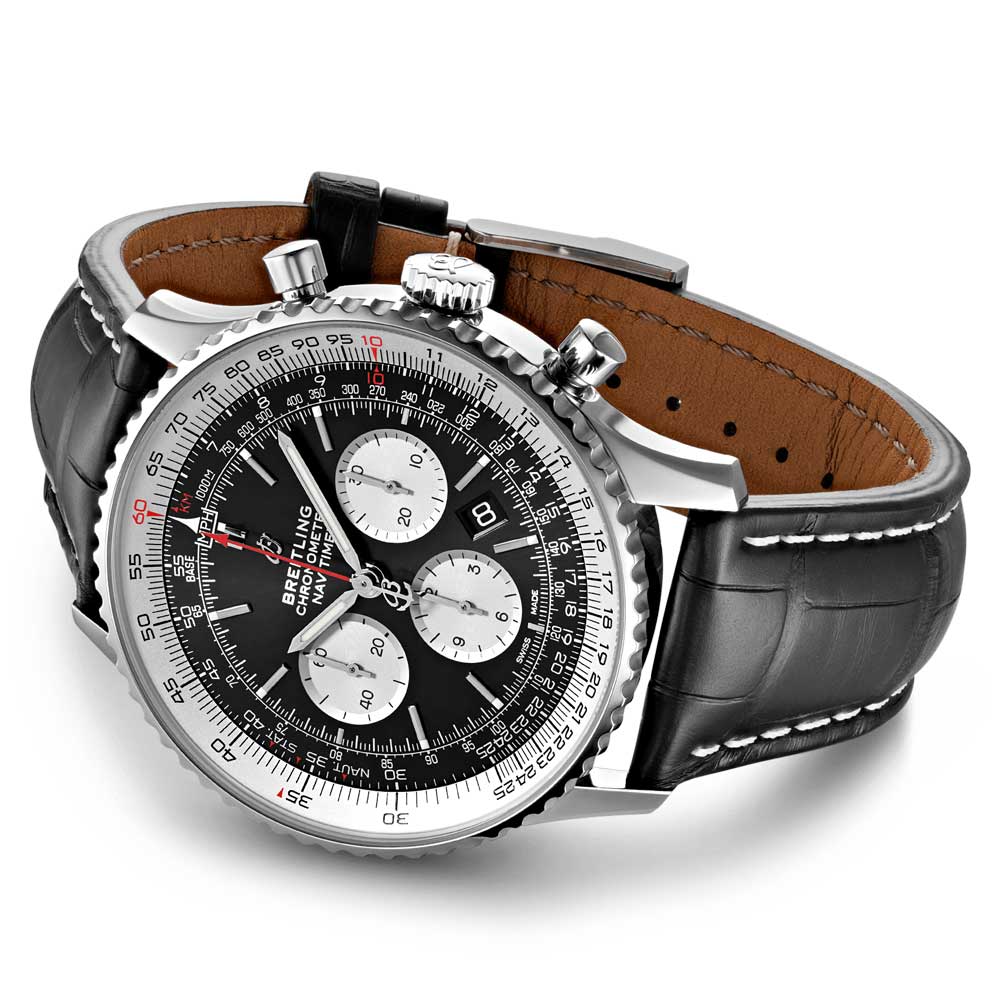Boasting a generous 46mm diameter. the iconic Navitimer features exquisite design accents that emphasize its presence on the wrist and maximize the dial readability. along with the signature circular aviation slide rule. The chronometer-certified self-winding chronograph calibre. Manufacture Breitling Calibre 01 is revealed through the transparent case back. Choose between steel. steel & gold. and red gold versions for a truly larger-than-life take on the legend.