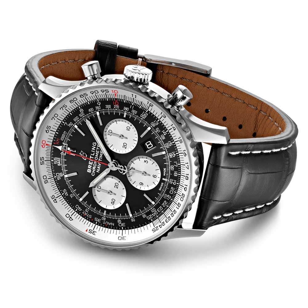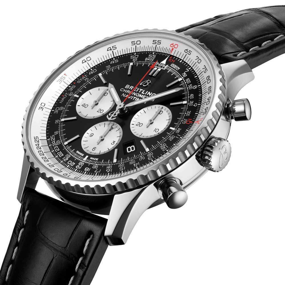 This distinguished timepiece boasts a generous 46 mm diameter to enhance its design. improving the readability of the dial and the iconic aviation slide rule. Peeking through the transparent caseback is the chronometer-certified. self-winding chronograph Breitling Calibre 01. Crafted from steel and steel & gold. this model can also be found with a red gold finish. An ultimate rendition of the timeless classic.