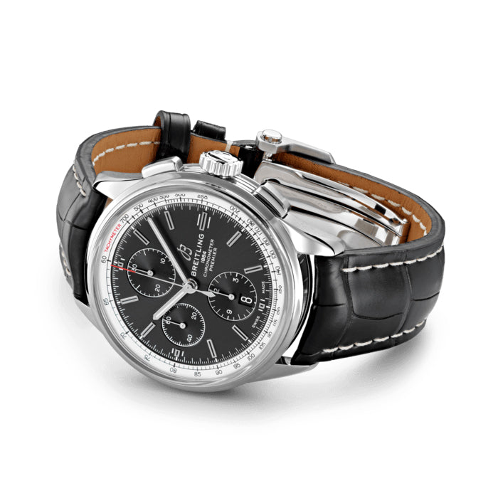 This Premier chronograph showcases a steel 42mm case complemented by a black crocodile leather strap and bold black dial. The watch's black chronograph counters are split by a quarter-second seconds hand at 12. 6. and 9 o'clock. It operates with a self-winding Breitling Calibre 13 with chronometer-certification. For further customization. this model is also available with a black nubuck strap or stainless steel bracelet. The Breitling Premier seamlessly combines luxury and style.